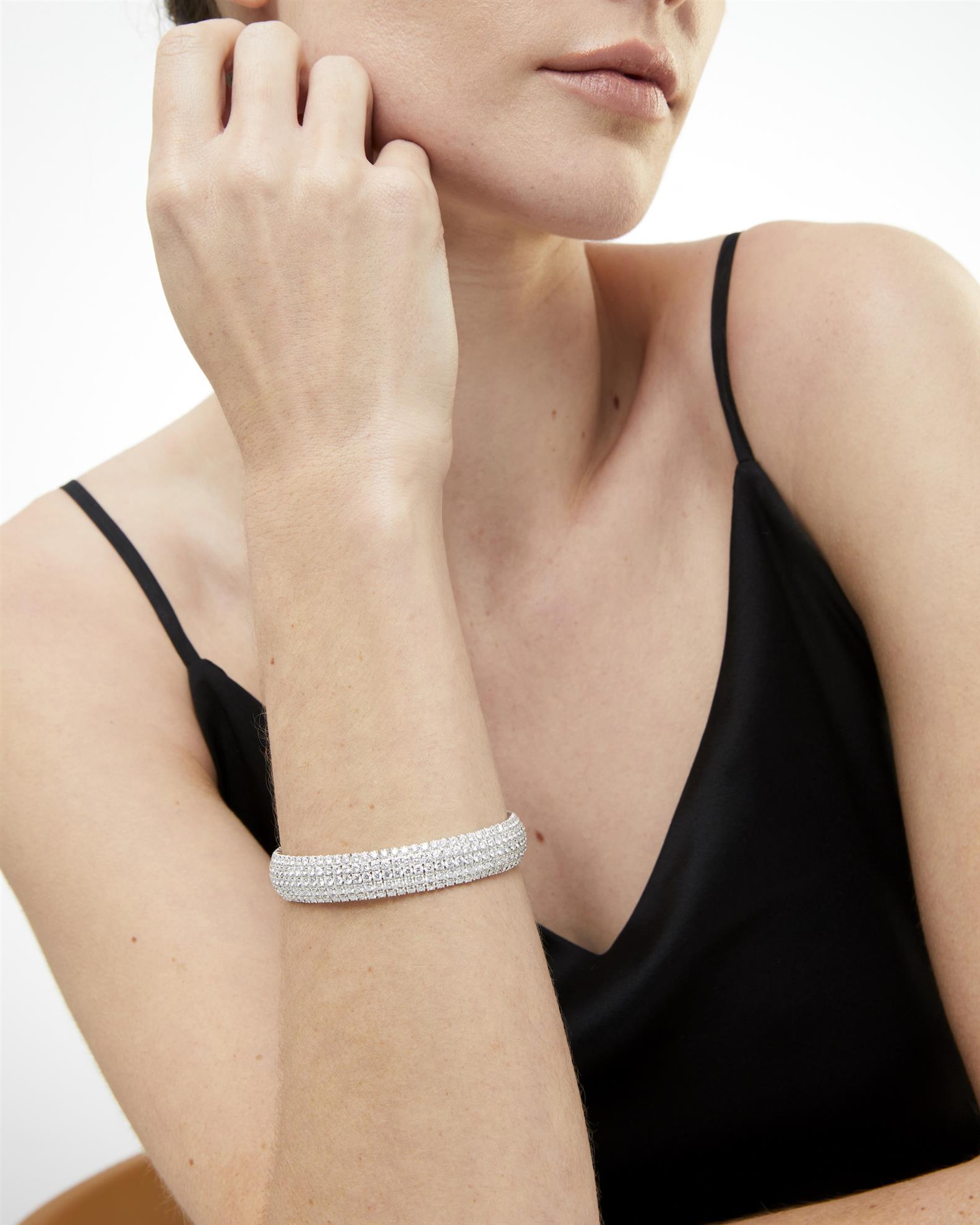 The 10mm high half round sprung cuff pavé-set with brilliant-cut diamonds, the diamonds together stated to weigh 15.23 carats, mounted in 18ct white gold, inner circumference 185mm.