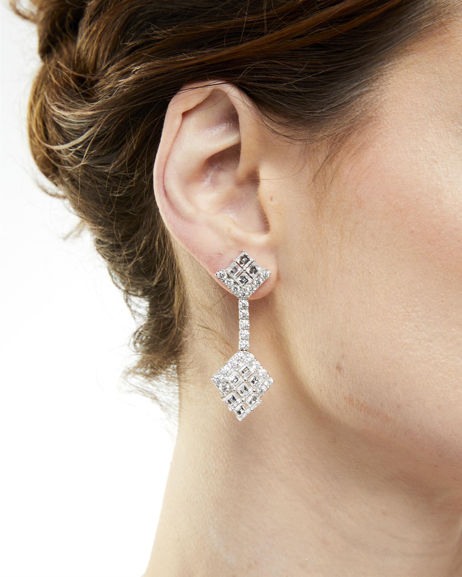 Each terminating in a cluster swing drop claw-set with carré and brilliant-cut diamonds suspended from a cluster surmount similarly set between a line of claw-set brilliant-cut diamonds, the diamonds together stated to weigh 10.30 carats, mounted in 18ct white gold, length 50mm, post and scroll fittings.
