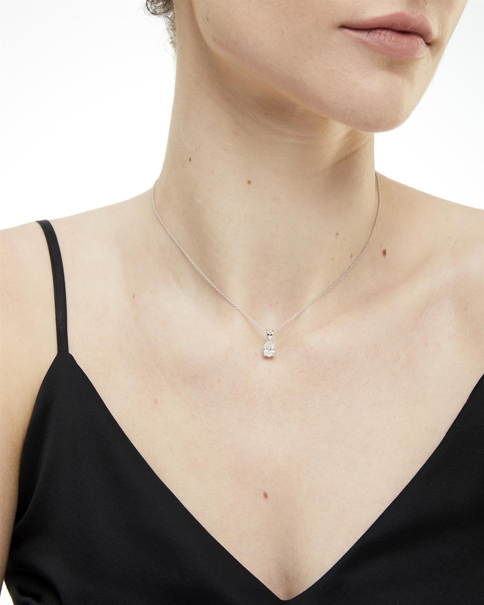 The claw-set pear brilliant-cut diamond weighing 1.21 carats, is completed by a fine trace chain, mounted in 18ct white gold, circumference 400mm.