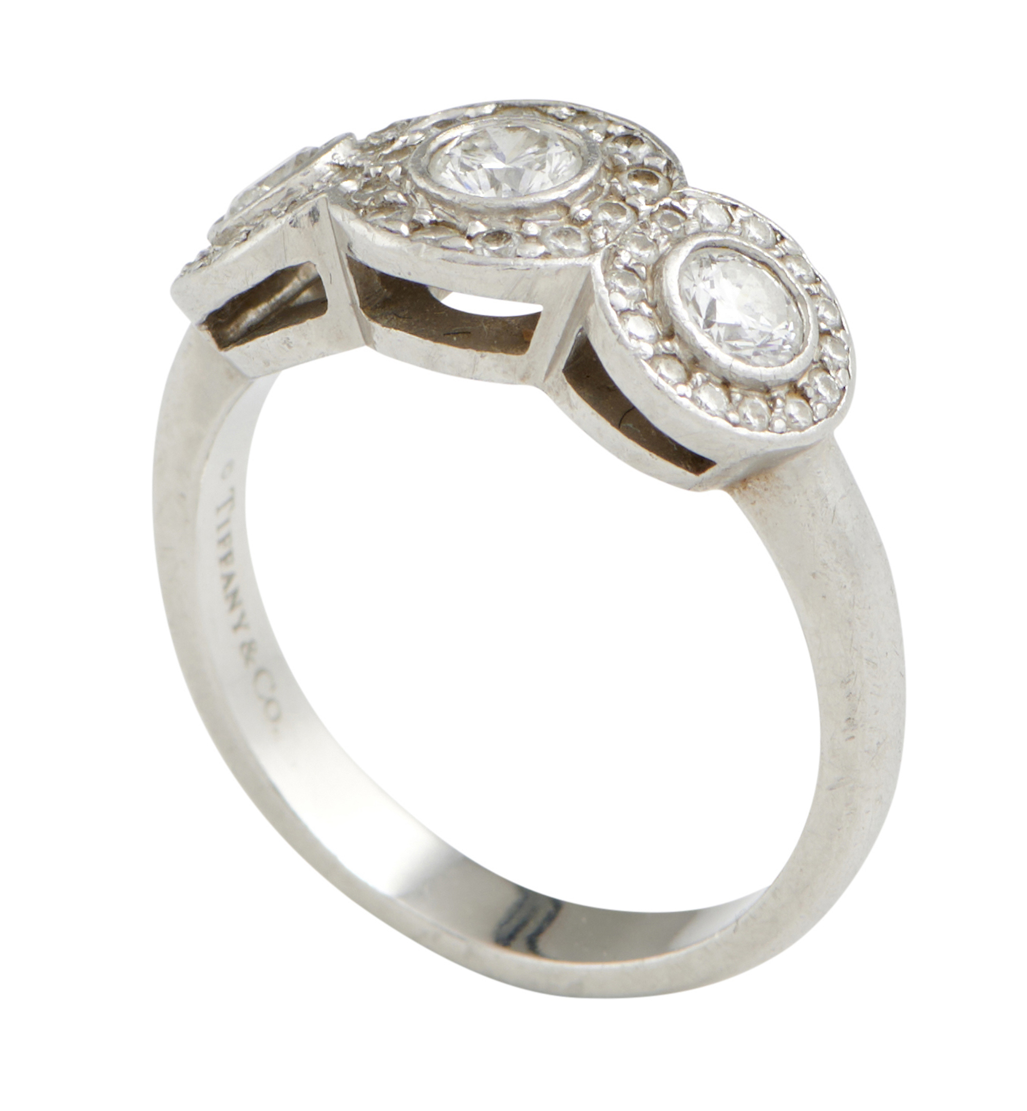 Comprising three bezel-set diamond clusters, the diamonds together weighing approximately 0.53 carats, signed Tiffany & Co., size K, accompanied by a Tiffany & Co. box.