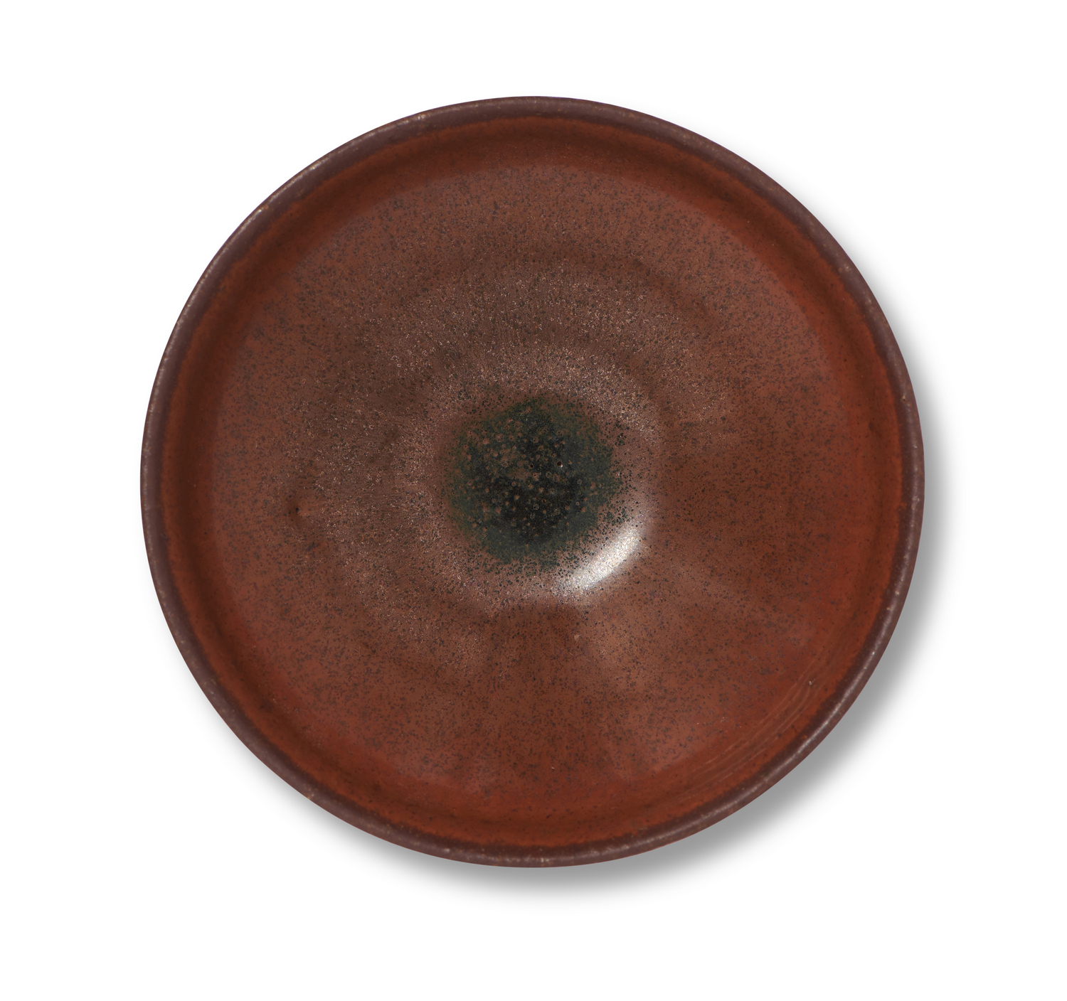 The thickly potted small bowl with everted rim covered in a thick russet glaze pooling black in the centre, the exposed biscuit at the base a deep chocolate brown colour.