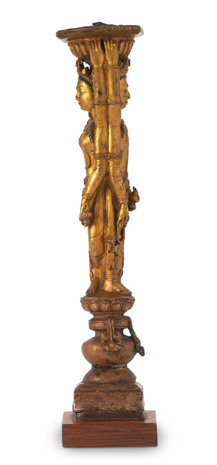 Cast with two four-armed Chakrasamvara retinue deities standing in tribhanga pose, one male, holding a mala in the right hand and a kundika in the left, and the other female holding a flower mala in both hands. The deities stand back to back on a kalasa pot, each with two arms raised to support a lotus blossom capital support, the male deity adorned with inset turquoise jewels. Fitted wooden stand.
