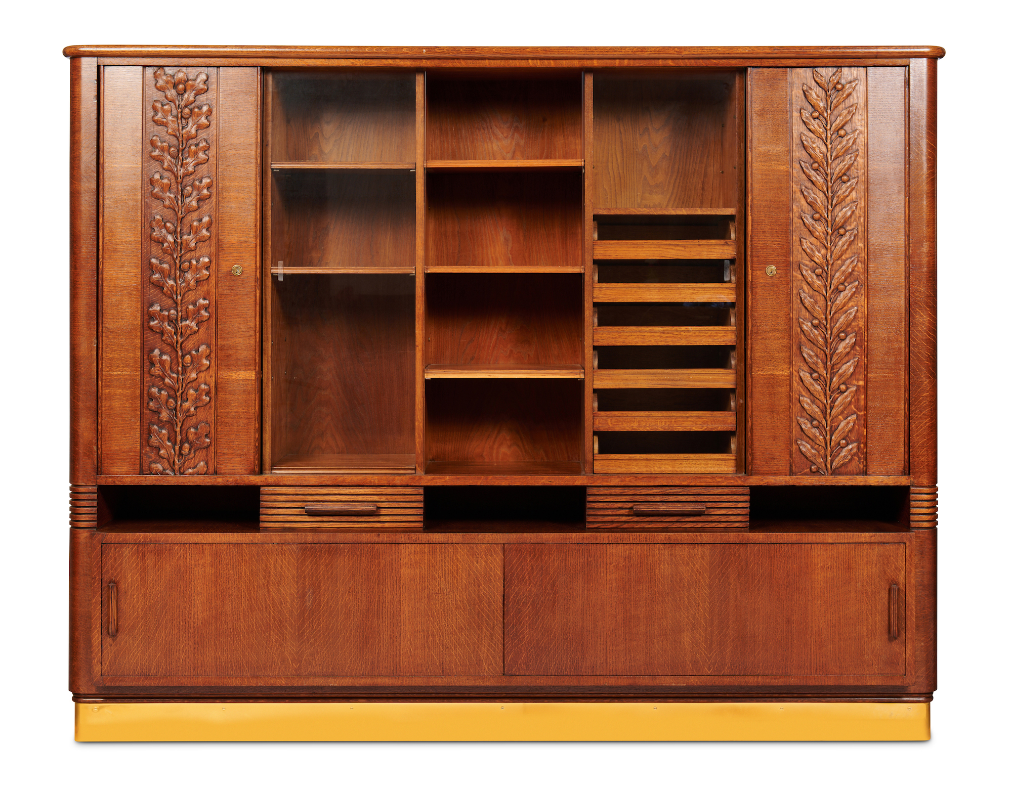Solid oak, veneer, brass and original glazed sliding doors (no keys).