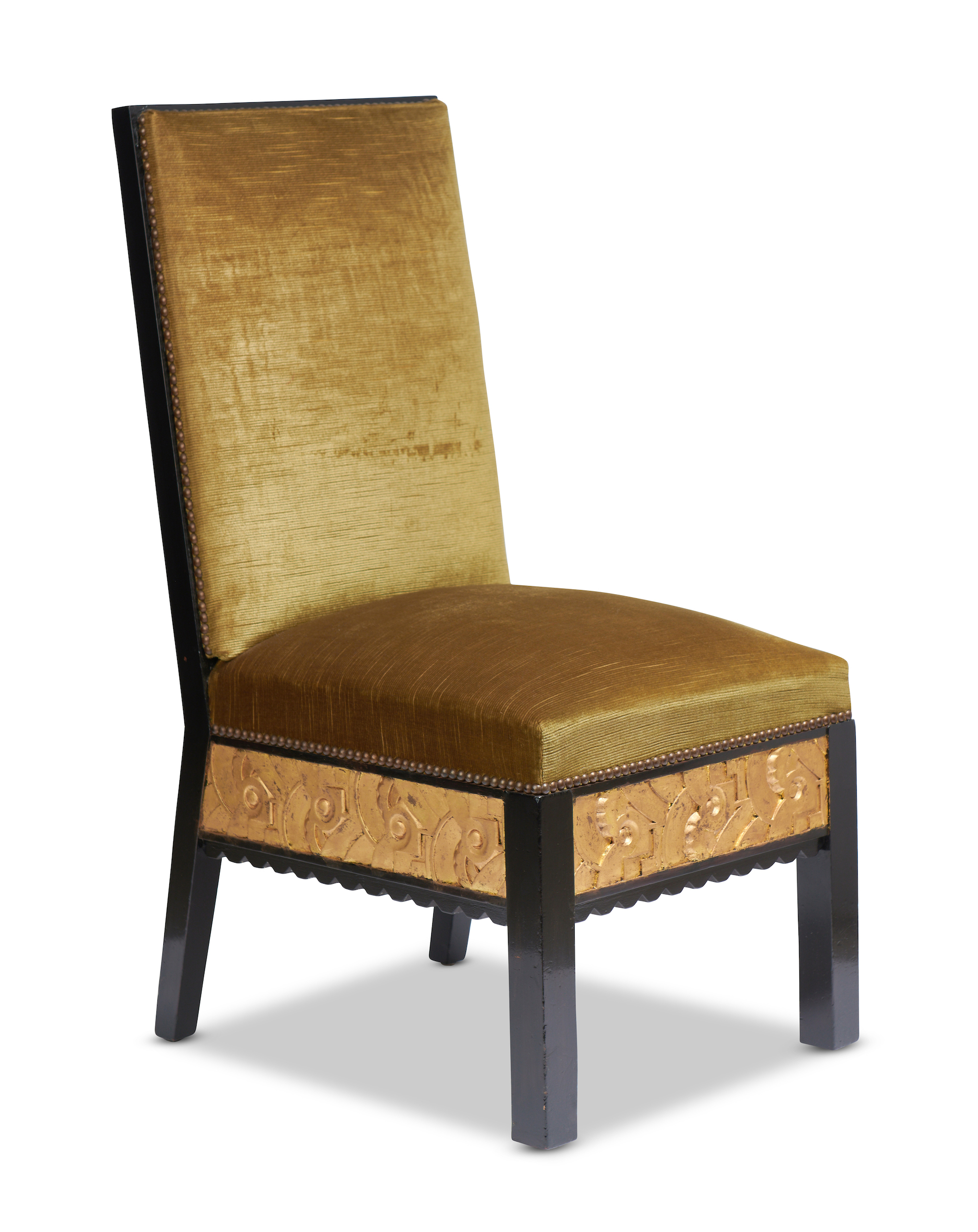 Original olive green upholstery. Carved wooden frame with gilded panels.