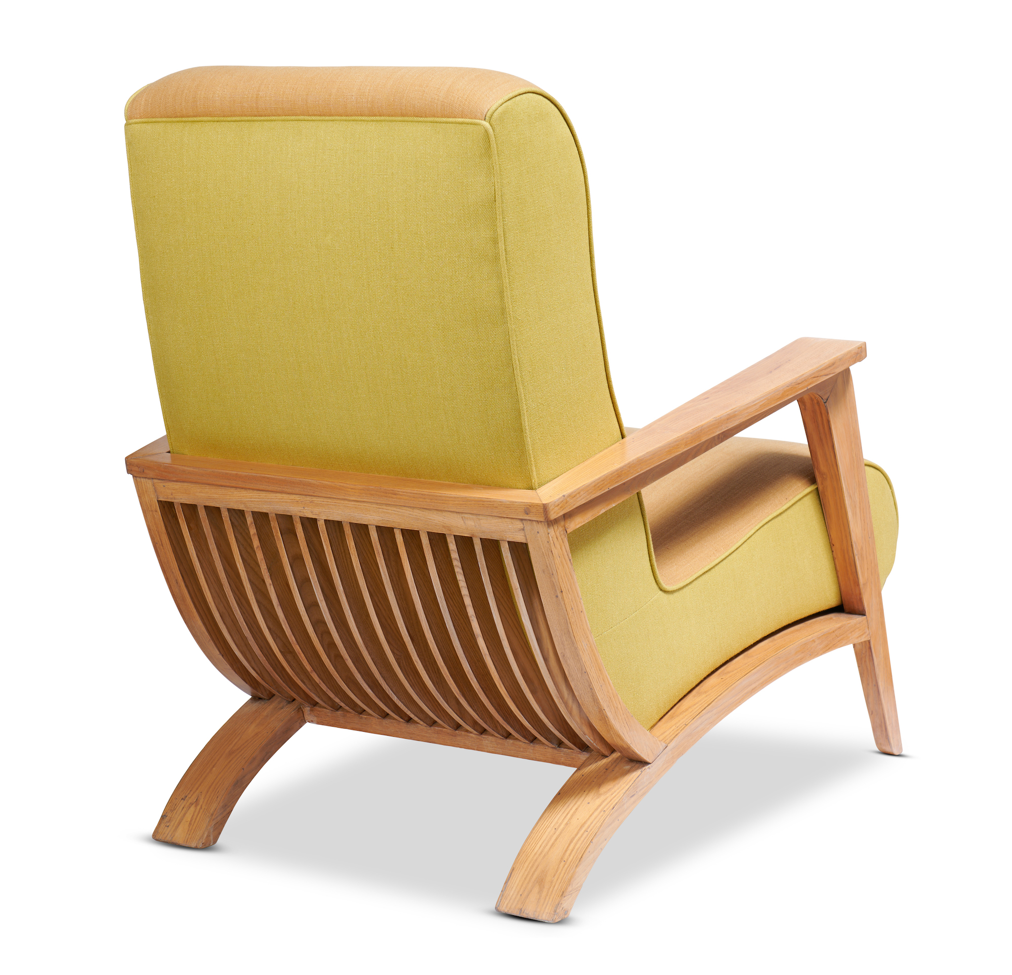 Minor surface scratches and fading consistent with age and use. Signs of repair. This chair has been restored, and re-upholstered new linen.