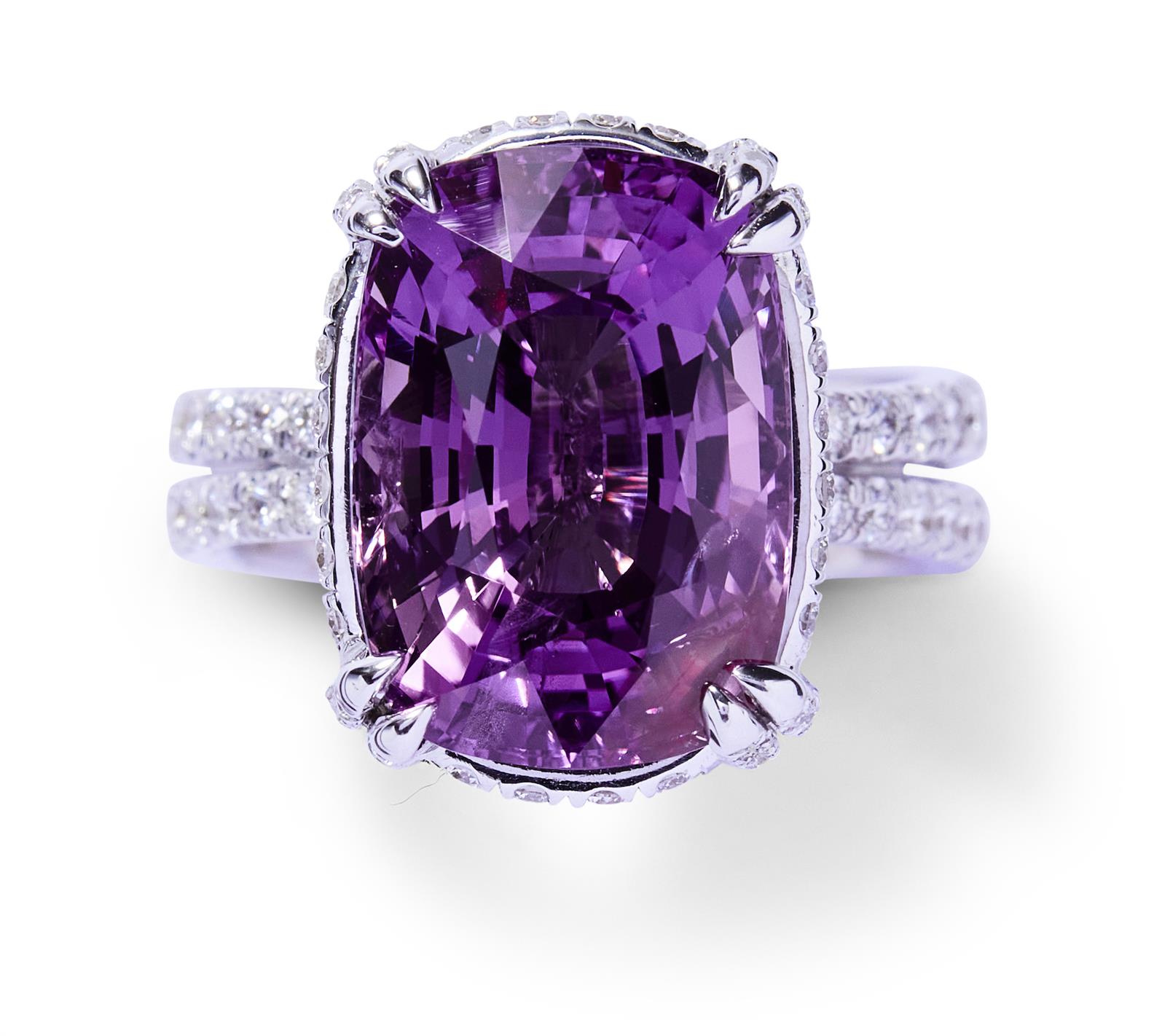 Centring a claw-set cushion-shaped pink-purple sapphire weighing 12.76 carats, supported from a gallery pavé-set with brilliant-cut diamonds to similarly set split shoulders, the small diamonds together weighing approximately 0.60 carat, mounted in 18ct white gold, size M1/2.