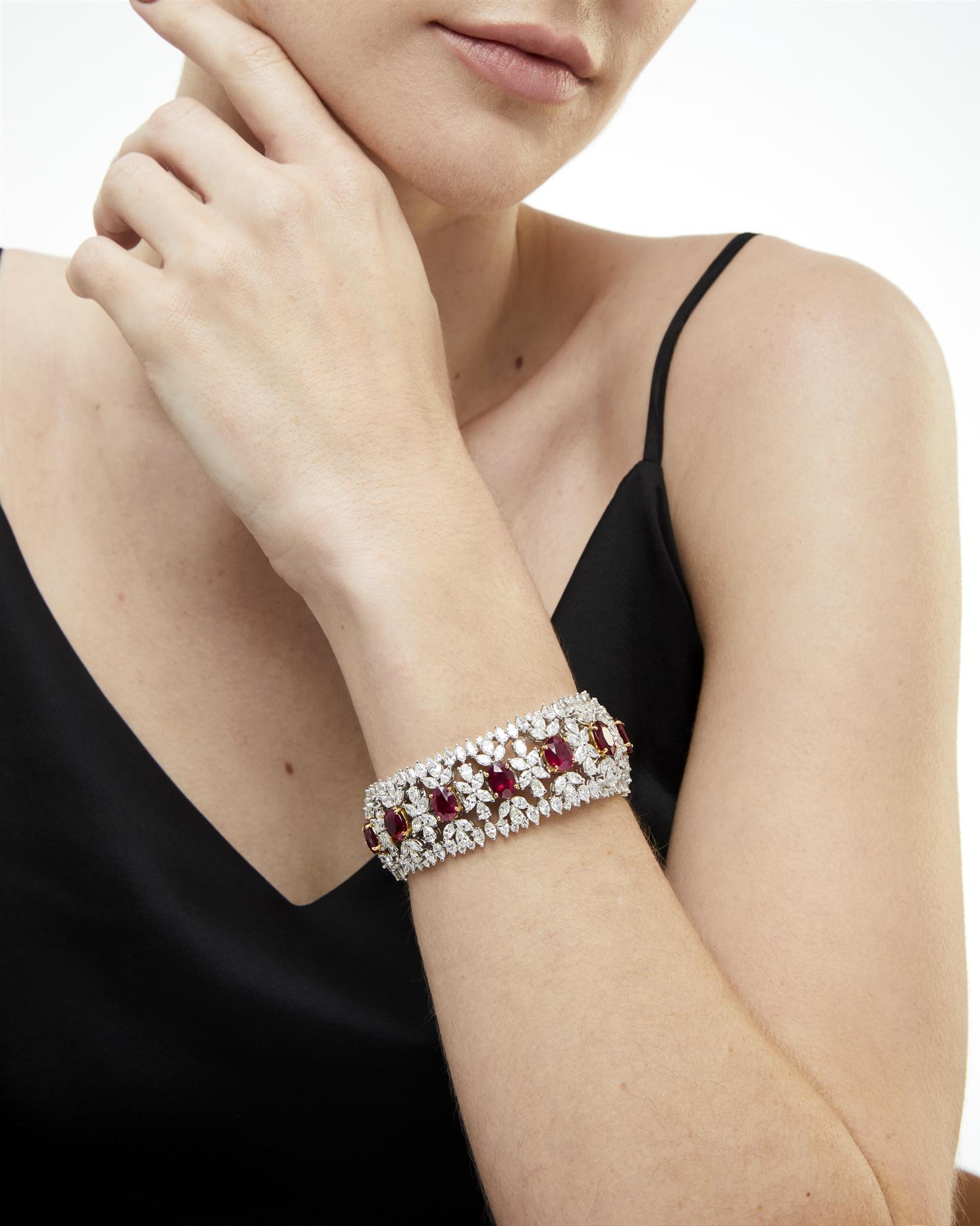 The wide openwork strap of foliate design is composed of a line of 13 claw-set oval rubies between similarily set marquise and pear-shaped diamonds, completed by a concealed box clasp, the rubies and diamonds together weighing approximately 27.73 carats and 35.13 carats respectively, mounted in 18ct gold,