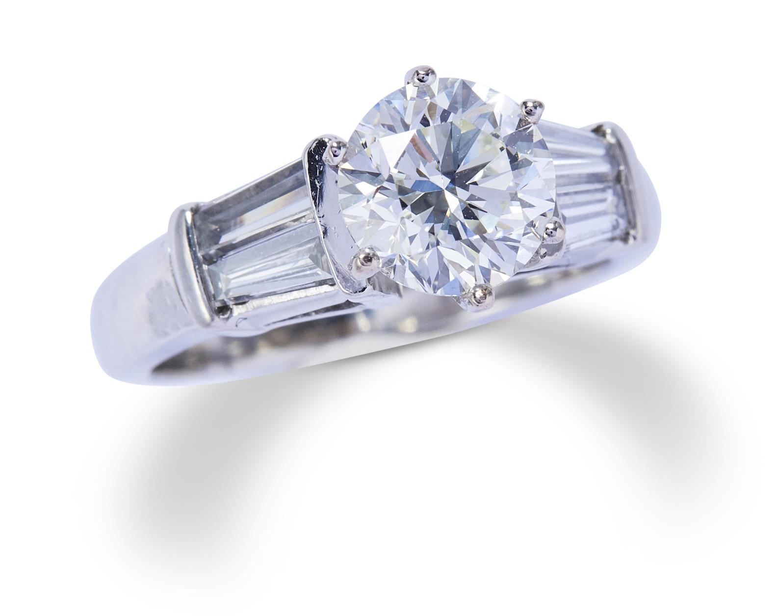 The round brilliant-cut diamond weighing 1.51 carats is claw-set between a pair of tapered baguette-cut diamonds together weighing approximately 0.60 carats, mounted in platinum, size J1/2.