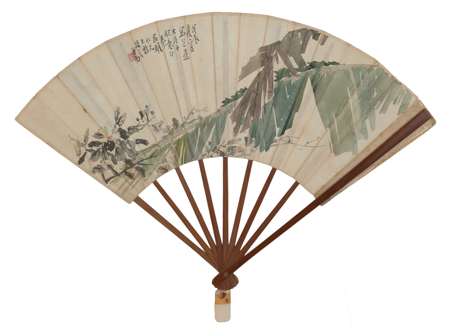 The bamboo fan mounted with a paper fan with a naturalistic painting of a banana leaf to one side in boneless style by Wang Yanan, and calligraphy to the other side by Wu Guandai. With an old paper tag with remnant wax seal attached.