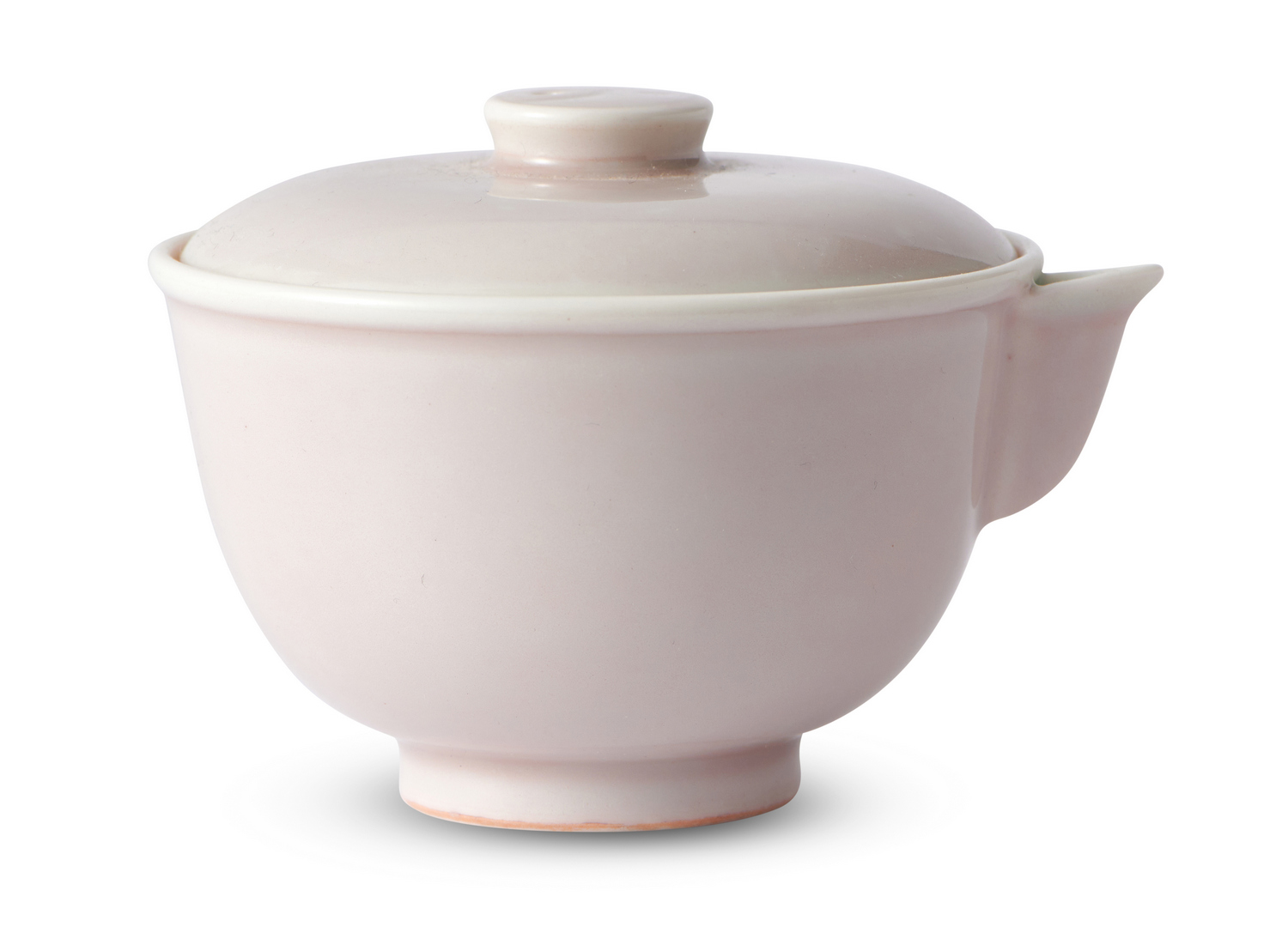 With gently rounded sides, the lid finial sculpted as a Yin-Yang symbol, covered in a pale pink 'okayu-ji' glaze. Impressed circular seal mark beneath for Seifu IV.