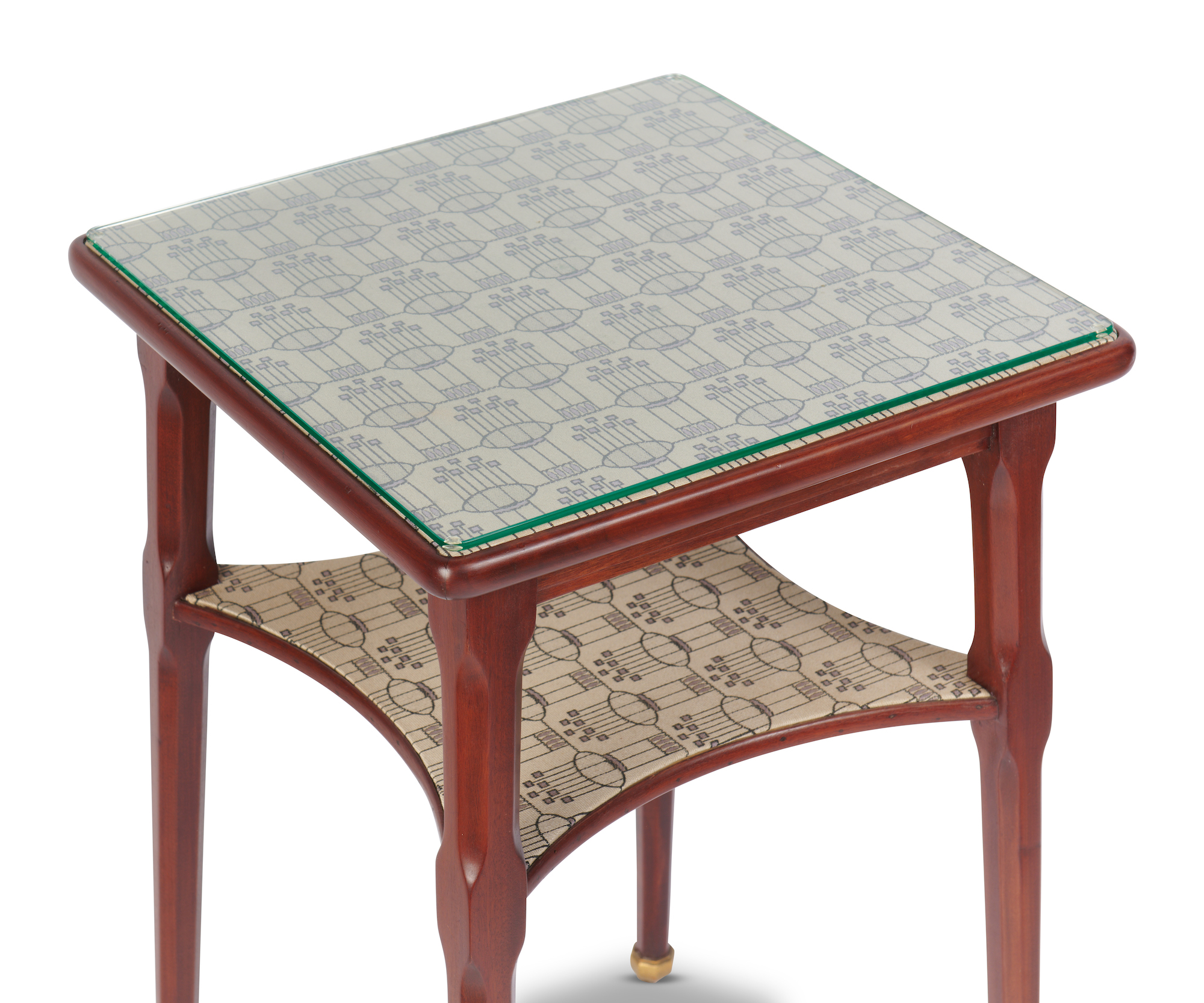 Two tier occasional table with Weiner Werkstatte fabric. Decorative brass feet.
