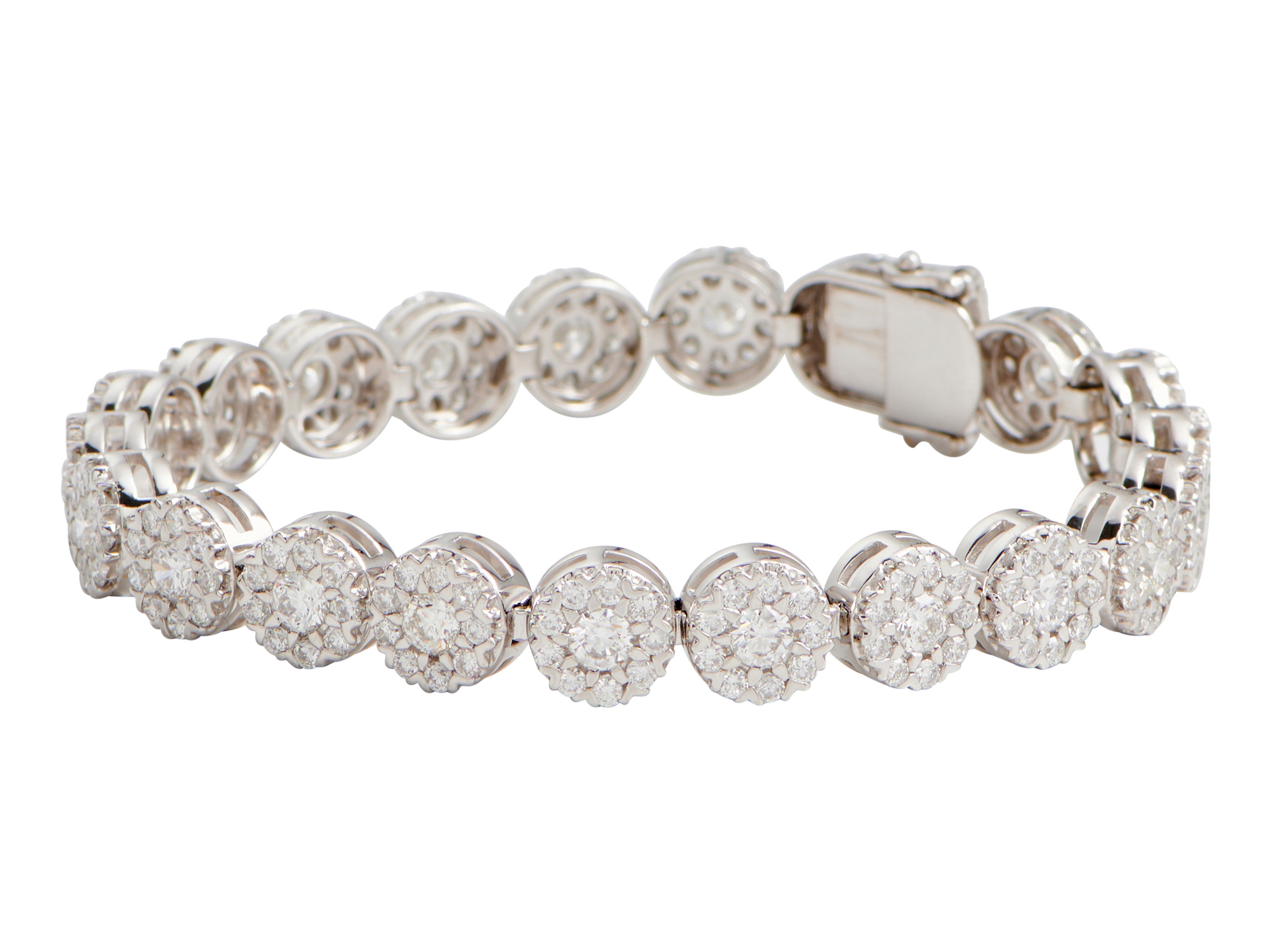 Designed as a continuous line of floral diamond clusters, each centring a brilliant-cut diamond weighing approximately 0.17 carats within a surround of further diamonds, the diamonds together weighing approximately 8.00 carats, stamped HB for Hardy Brothers, length approximately 180mm, accompanied by a Hardy Brother box.