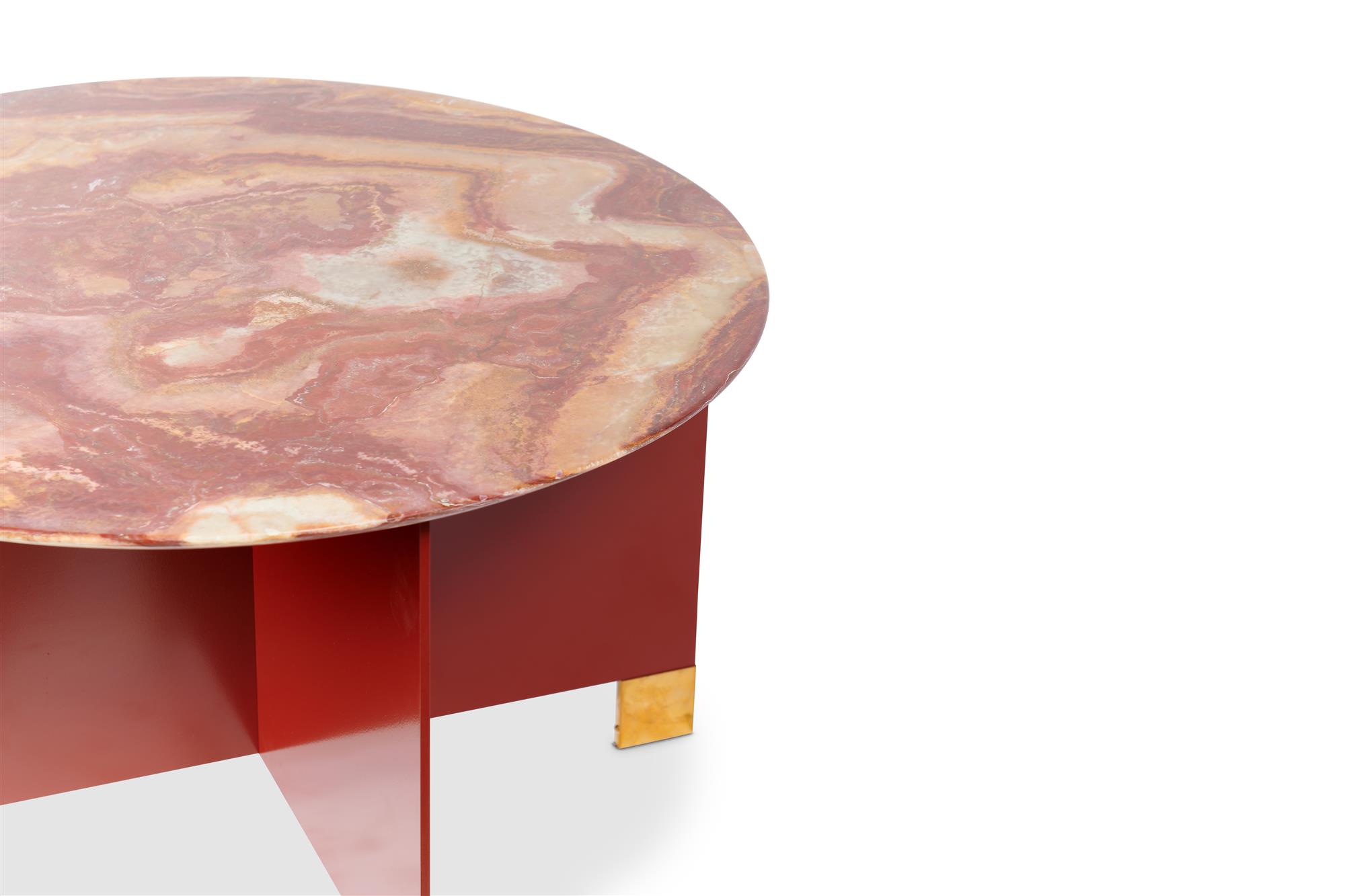 Chamfered marble, red powder coated steel with brass feet.