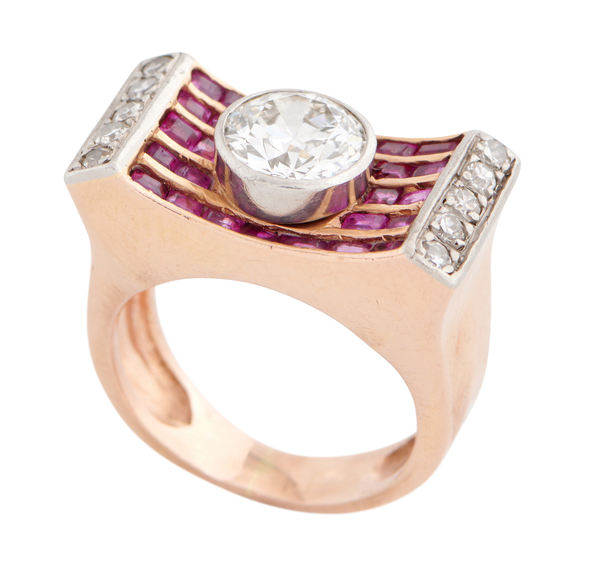 Comprising a concave plaque centring a collet-set old European-cut diamond weighing approximately 1.50 carats within a surround of calibre-cut rubies terminating in diamond panels, size K.