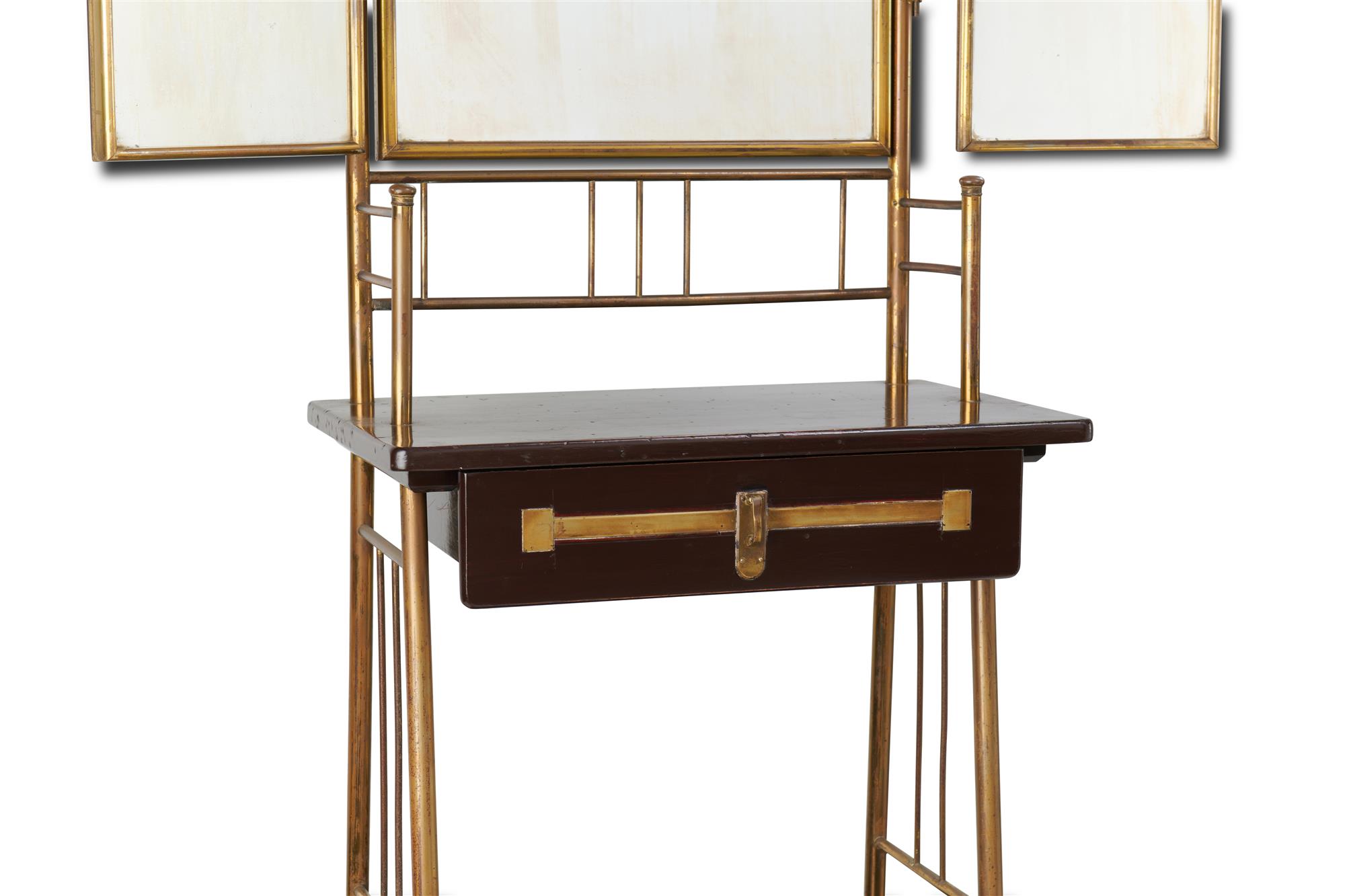 Central mirror with adjustable side mirrors, brass and timber. Single drawer with lower shelf.