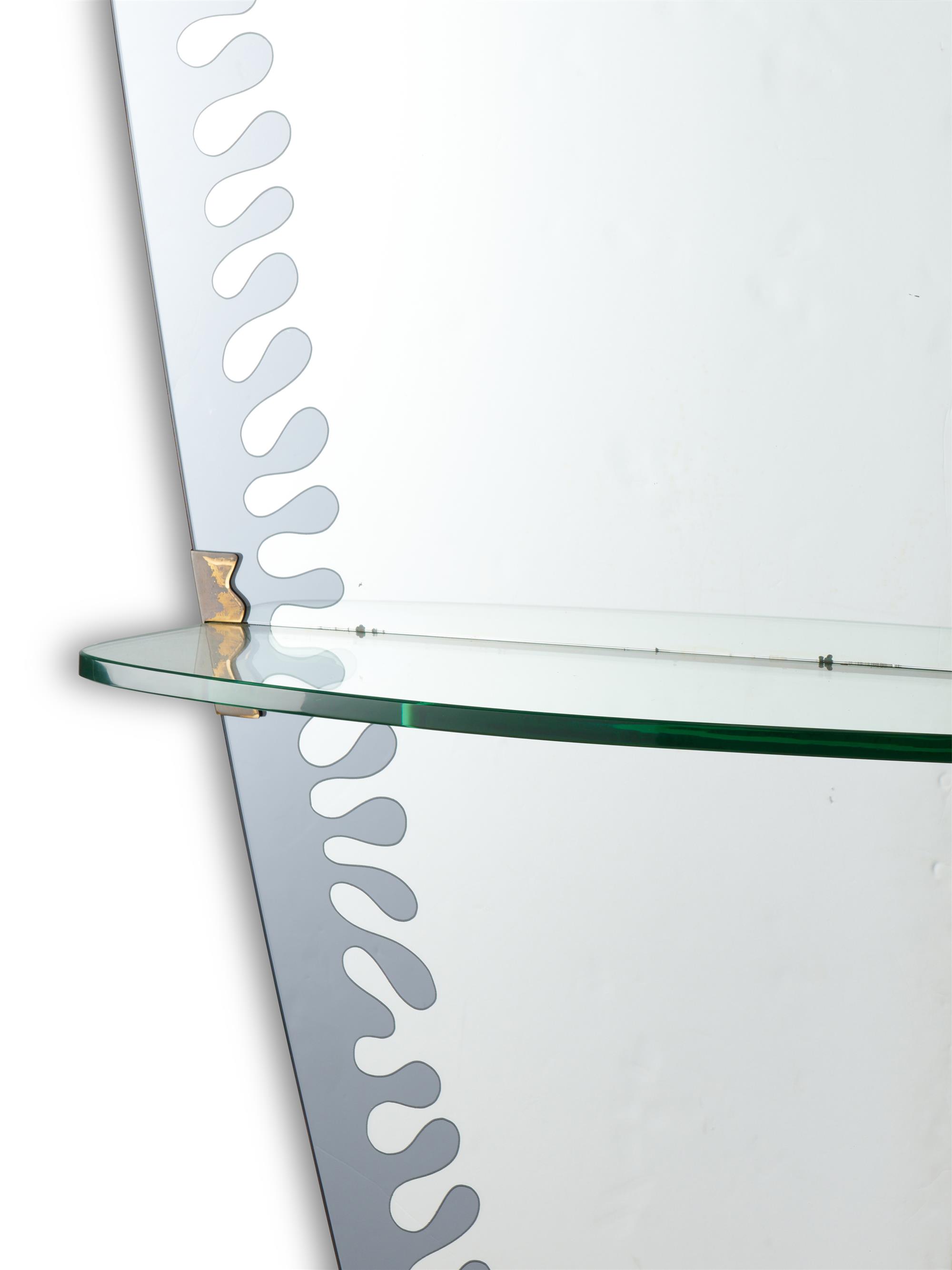 Timber back with decorative mirror and glass shelf, brass fittings.
