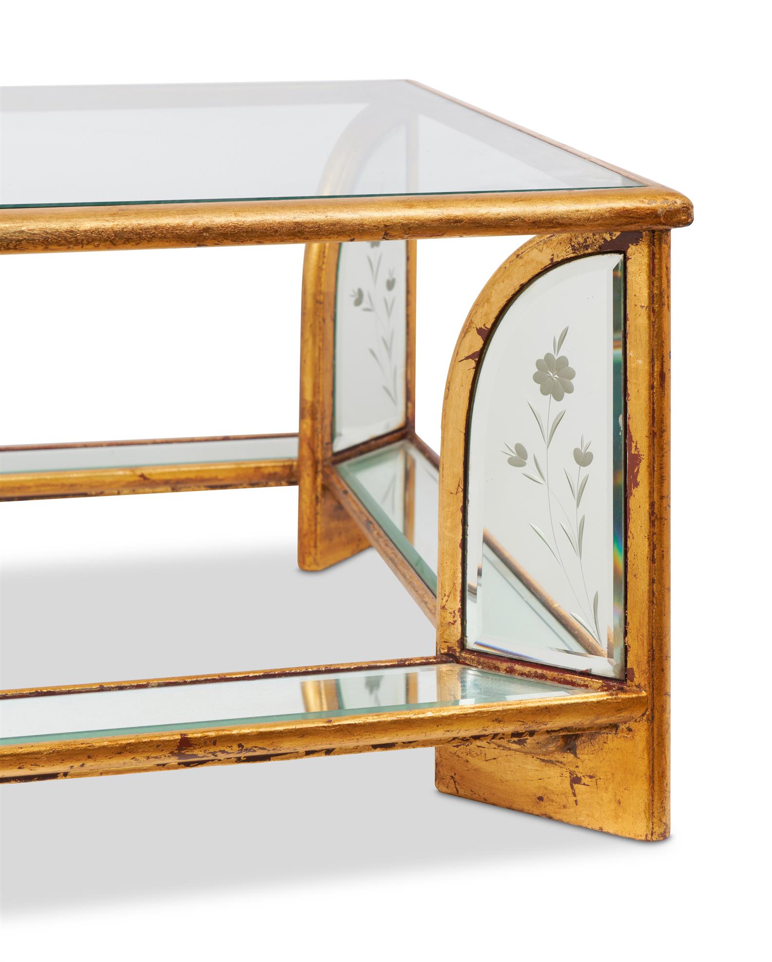 Gilded and mirrored coffee table with etched decoration.