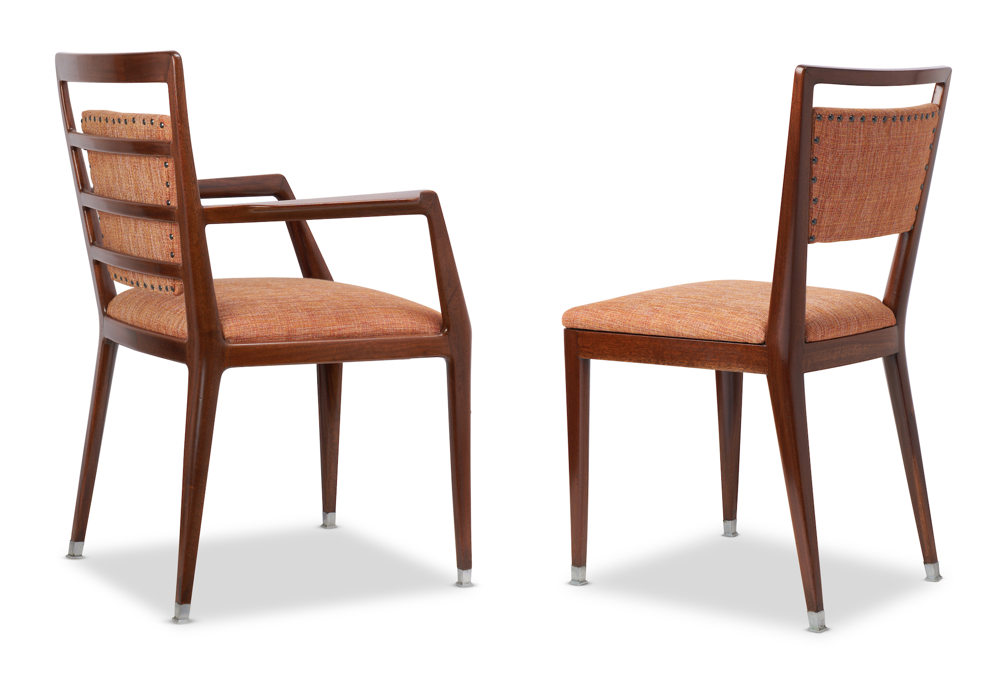 Rosewood frames reupholstered in quality linen & cotton fabric. Nickel plated sabots.
