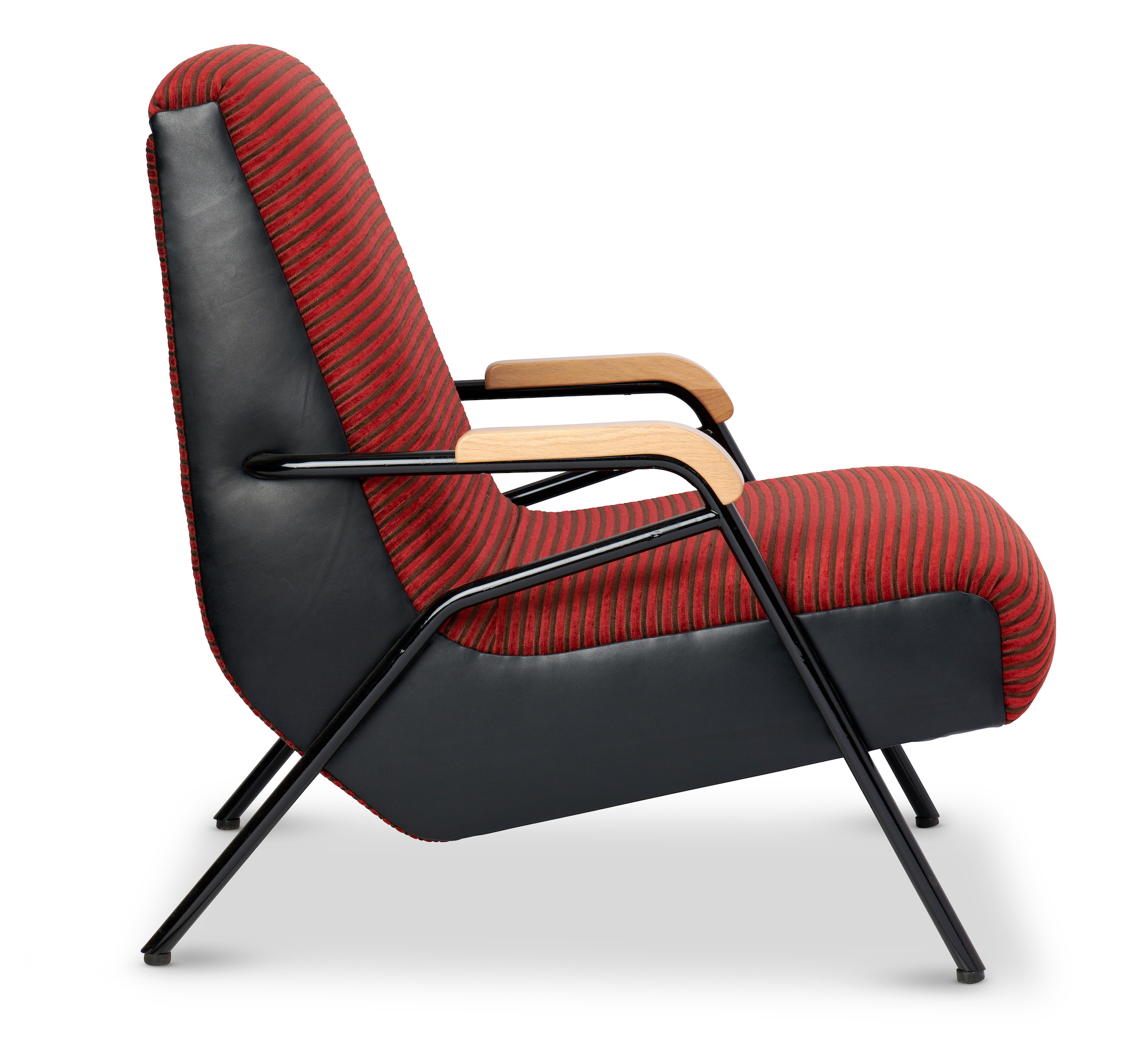 Striped chenille fabric and vinyl, painted metal and timber.