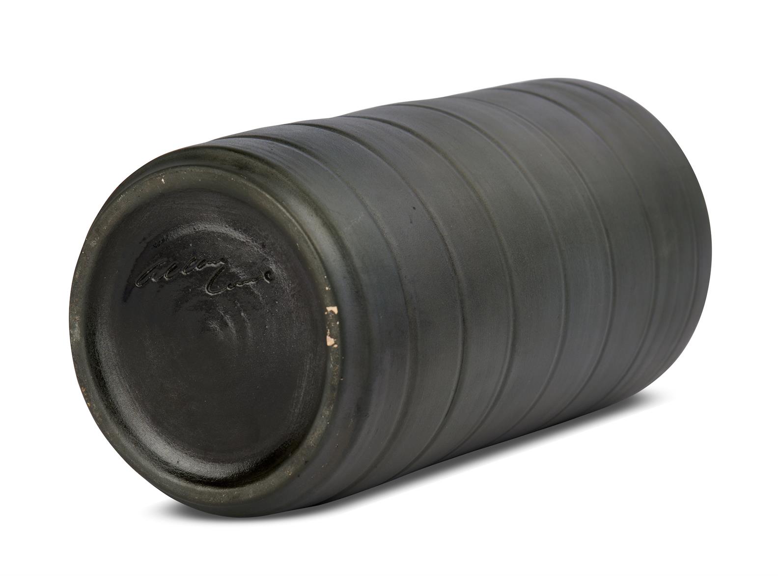 Black ribbed ceramic vase with white interior.