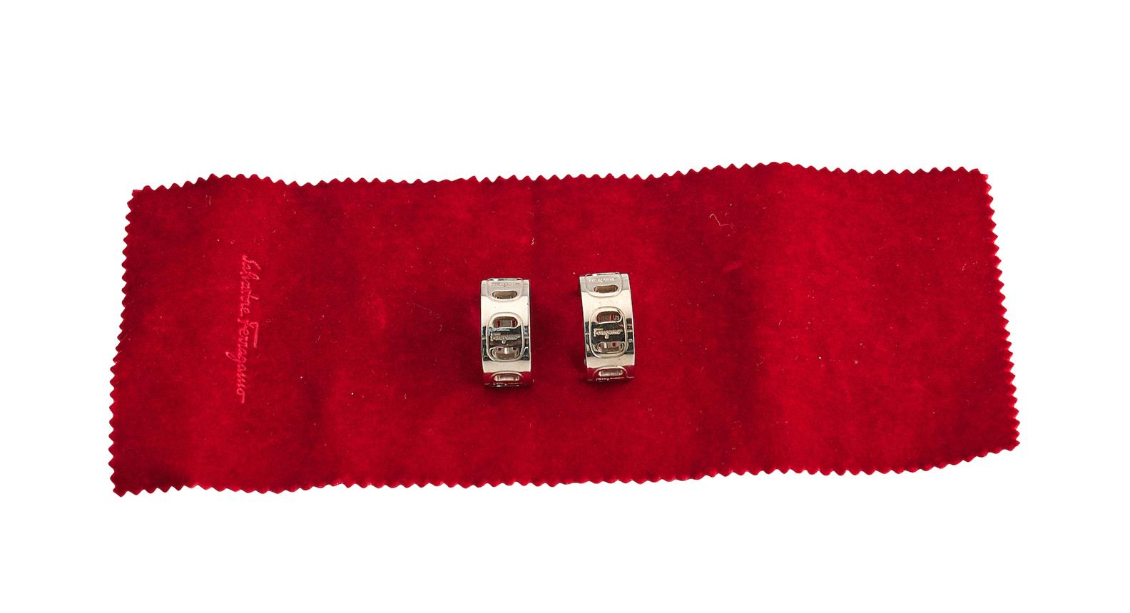 SALVATORE FERRAGAMO, PAIR OF EARRINGS - The large half hoop clip earrings of openwork design in silver tone metal.