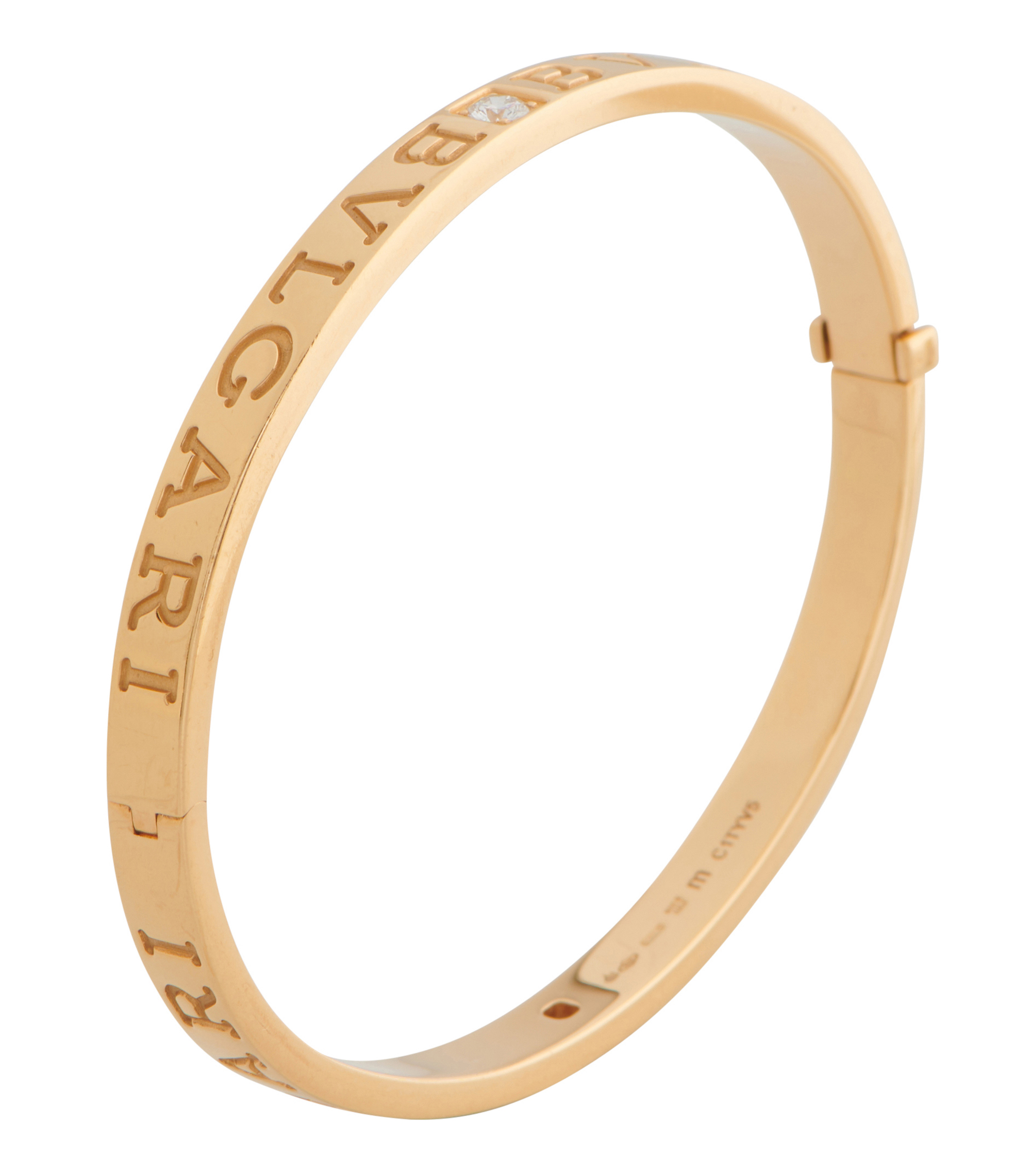 The oval hinged bangle, each side inscribed BVLGARI BVLGARI and centring a brilliant-cut diamond, together weighing approximately 0.26 carats, signed and numbered C1TYV5, inner diameter approximately 60mm, accompanied by a Bulgari box.