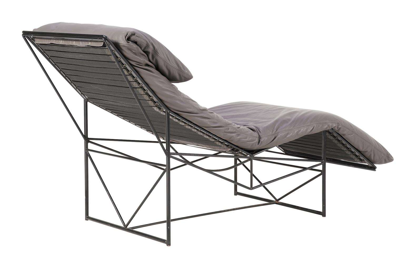 Grey leather cushioning on a black painted metal frame with elastic straps.