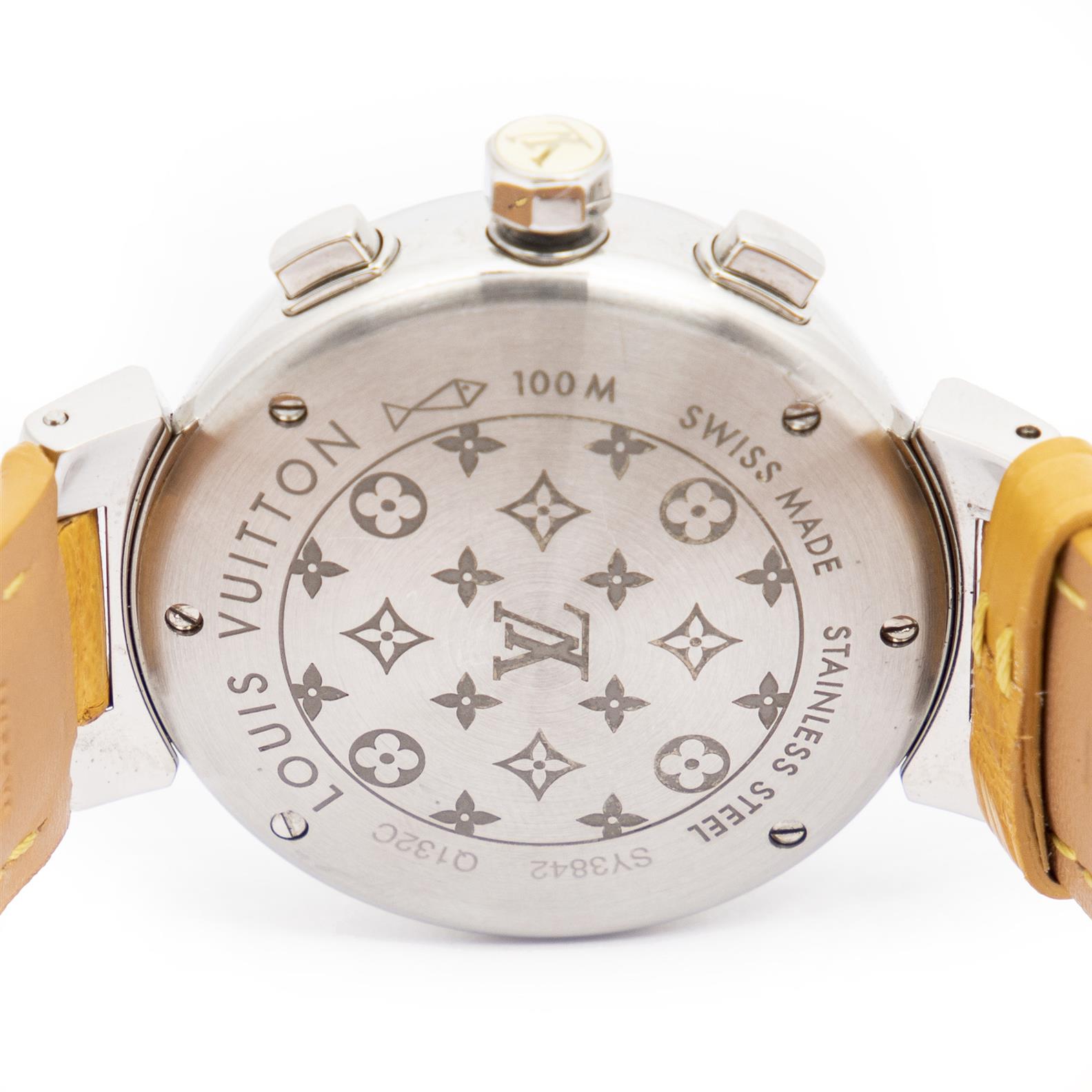 LOUIS VUITTON, Q132C TAMBOUR LOVELY CUP MM WRISTWATCH - Quartz movement, white circular dial with batons and Arabic numerals, stainless steel case and yellow embossed leather straps, dial diameter 28mm, boxed.