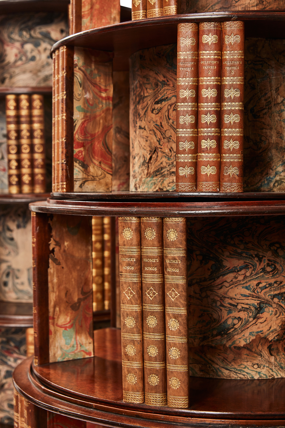 One largely George IV, the other modern, each with a reeded finial above four graduated tiers with faux books and marbled paper, on a tapering lotus carved pedestal and triform base with bun feet.