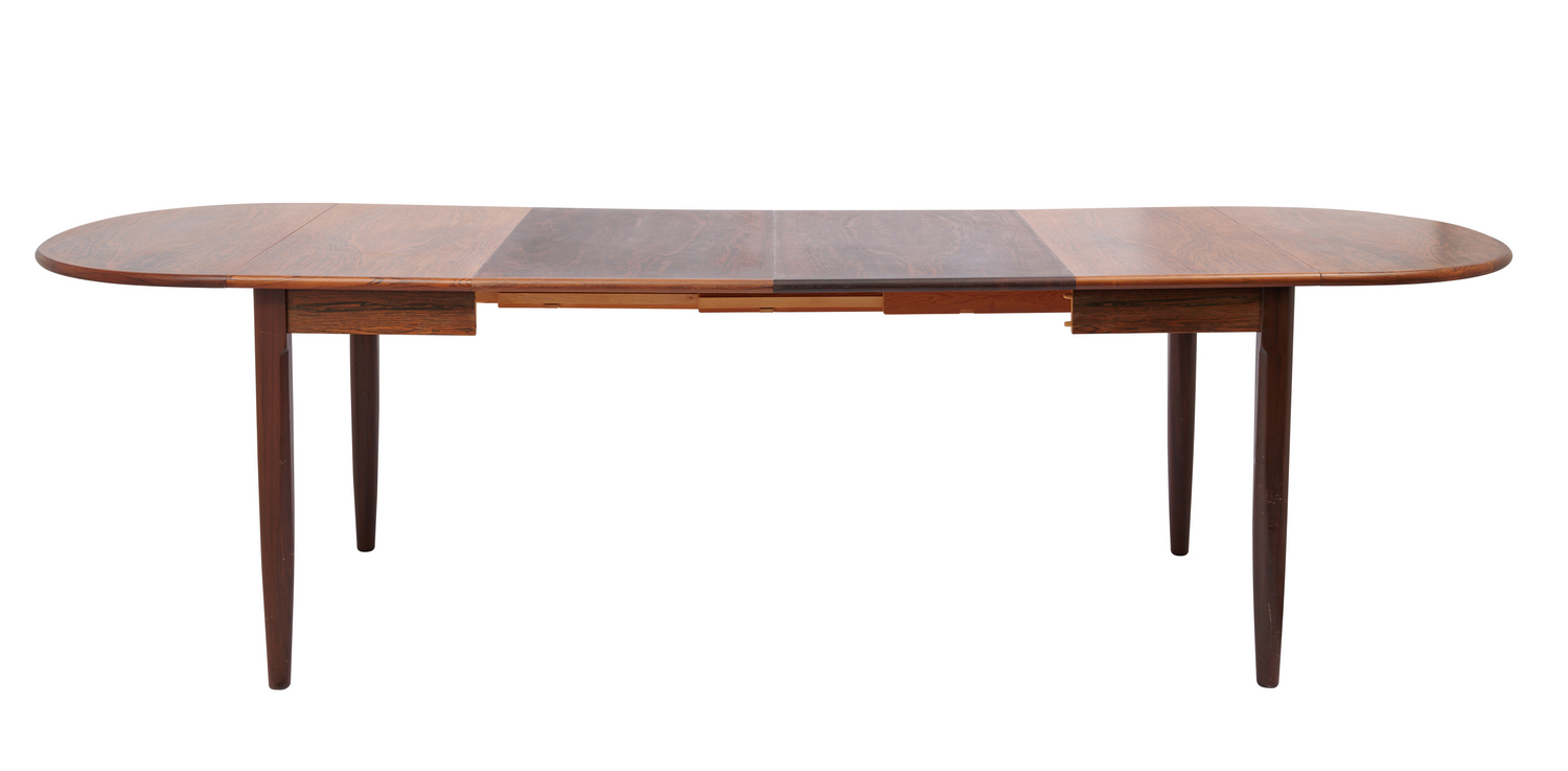 D-end extension dining table in rosewood veneer. Two central rectangular leaves and two demi-lune end leaves
