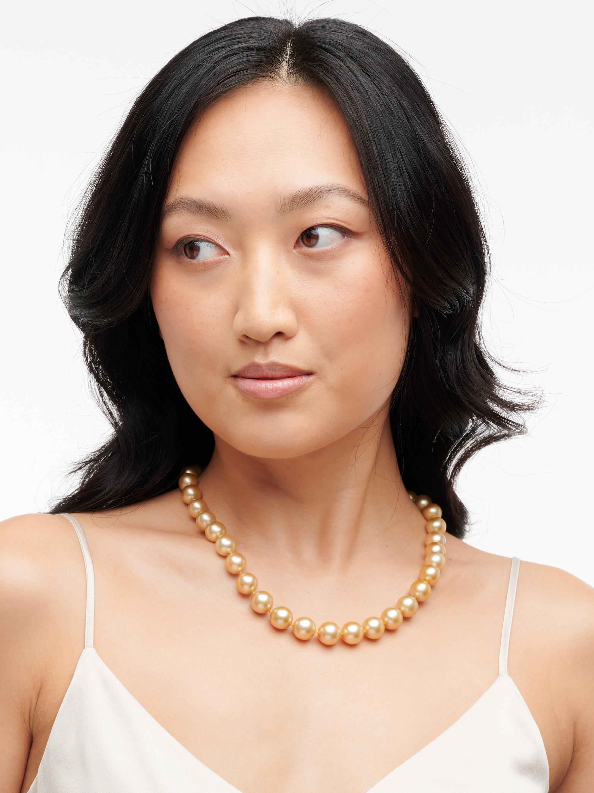 Comprising thirty-seven graduating round pearls of golden hues measuring approximately 10.9mm - 13.9mm, completed by a bean shaped clasp in 14ct gold, length approximately 420mm.