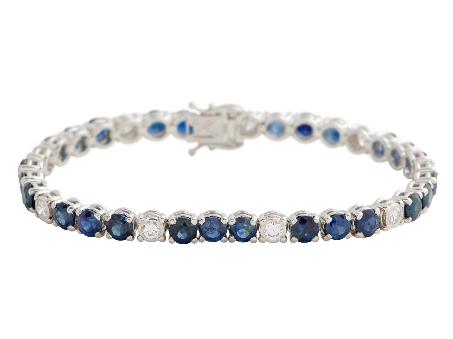 A SAPPHIRE AND DIAMOND BRACELET IN 18CT WHITE GOLD, THE 27 ROUND CUT SAPPHIRES WEIGHING APPROXIMATELY 14.30CTS, THE DIAMONDS TOTALLING APPROXIMATELY 1.45CTS (VS-SI, G), LENGTH 180MM, WEIGHT 20.7GMS, ACCOMPANIED BY VALUATION
