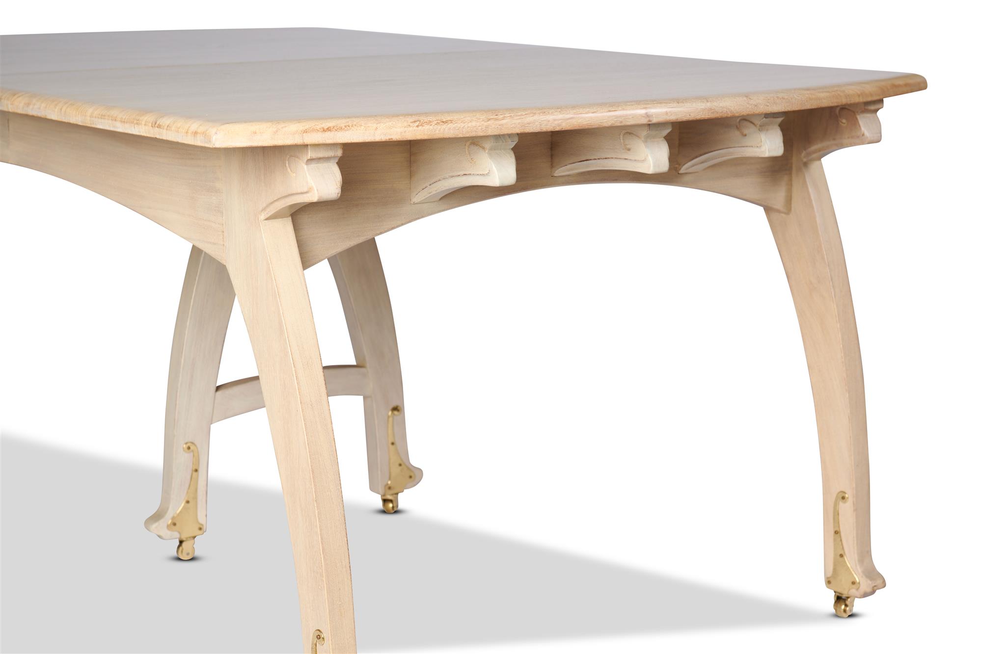 Extension dining table. Limed finish with brass hardware and castors. Stamped to base. Comes with two party leaves.