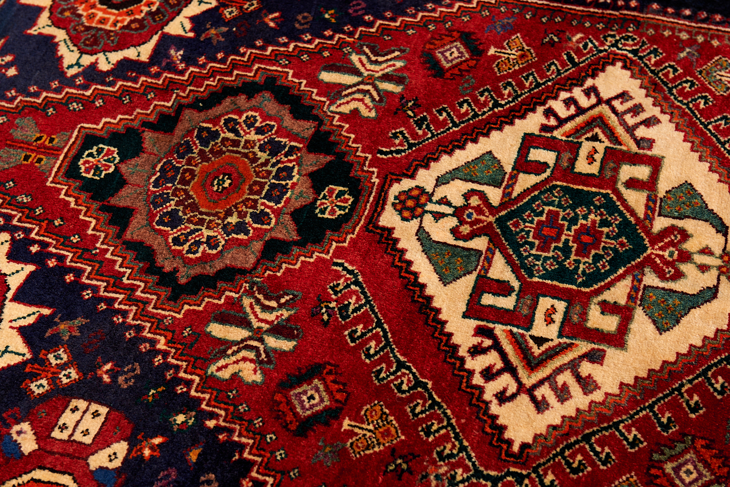 A TRIBAL PERSIAN QASHQAIE RUG. 100% WOOL. DENSE PILE. HAND-KNOTTED TRIBAL WEAVE WITH DESIGN OF TRIPLE DIAMOND MEDALLIONS AND SECONDARY ROSETTE MEDALLIONS IN A NAVY-BLUE FIELD OF FLORAL & "TREE OF LIFE" PATTERNS. BORDER OF TRIBAL MOTIFS SIZE: 165 X 113 CM ORIGIN: PERSIA - RRP: $1,100 DOCUMENTATION OF AUTHENTICITY INCLUDED.