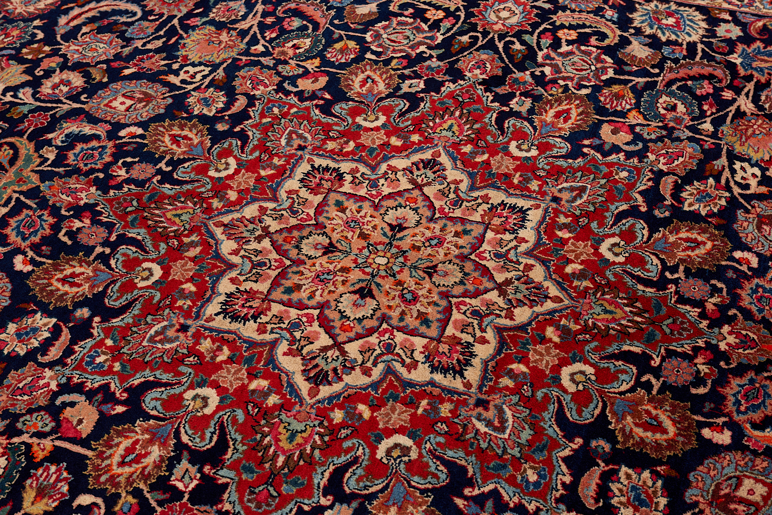 A STUNNING FINE PERSIAN SOLID & DENSE KHORASAN CARPET.100% THICK WOOL, PLUSH PILE, HARD-WEARING. HAND-KNOTTED WEAVE WITH A CENTRAL FLORAL ELONGATED MEDALLION WITH ALL OVER SHA ABBAS PALMETTES IN FRENCH BLUE, ROSE AND CREAM IN A DEEP BLUE FIELD OF FOLIAGE AND FLORAL SPRAYS. MAJOR BORDER OF PALMETTES IN A SOFT TERRACOTTA, MINOR BORDER OF FLORAL SPRAYS IN CREAM. SIGNED PIECE ‘MASHAD FAZLI' ATELIER. SIZE: 390 X 310 CM ORIGIN: PERSIA – RRP: $11,000 DOCUMENTATION OF AUTHENTICITY INCLUDED.