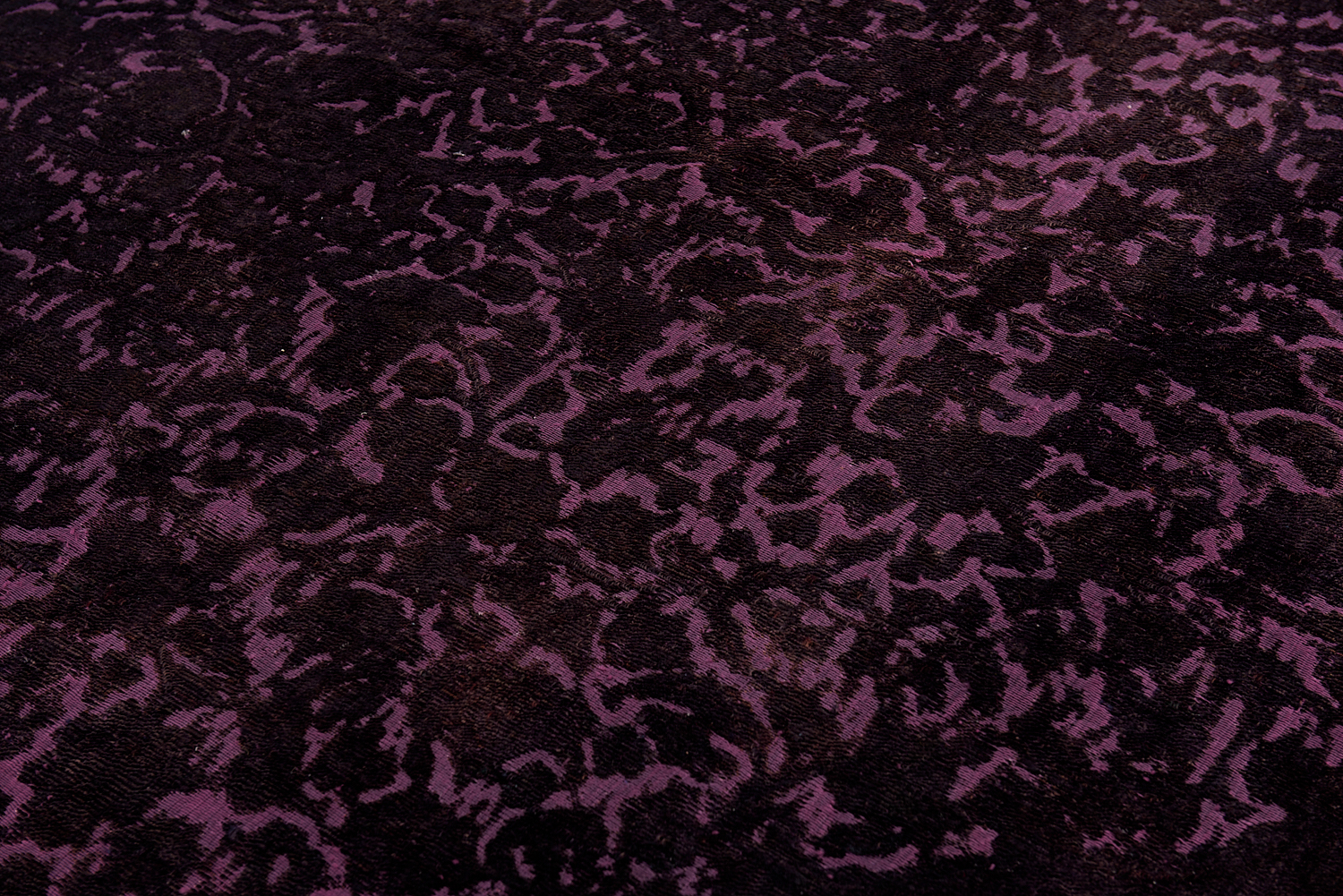 A MAGNIFICENT SUPERFINE MODERN VINTAGE OVER-DYED PERSIAN KERMAN CARPET, VINTAGE PILE. A ONE-OF-A-KIND MODERN CARPET CREATED FROM AN AUTHENTIC VINTAGE MEDALLION DESIGN KERMAN CARPET WITH THE PILE SHORN. THE ENTIRE IS OVER-DYED IN PURPLE AND CHARCOAL TONES. GALLERY EXHIBITED. SIZE: 388 X 292 ORIGIN: PERSIA – RRP: $7,500 DOCUMENTATION OF AUTHENTICITY INCLUDED.