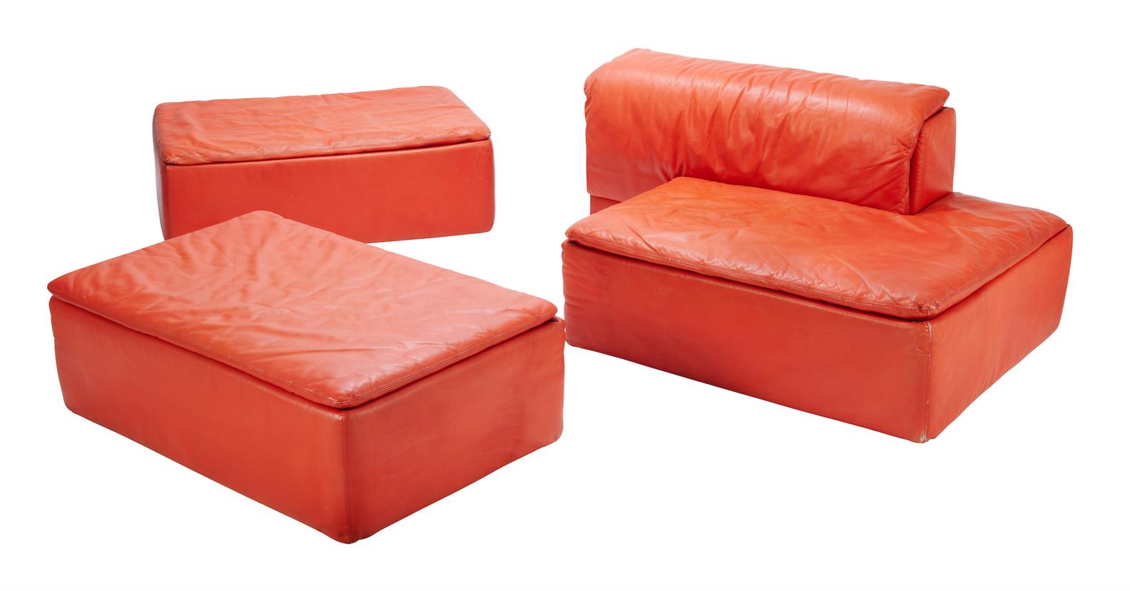 Consists of three modules and a detachable back rest. Red leather and polyurethane on a moulded plastic frame.
