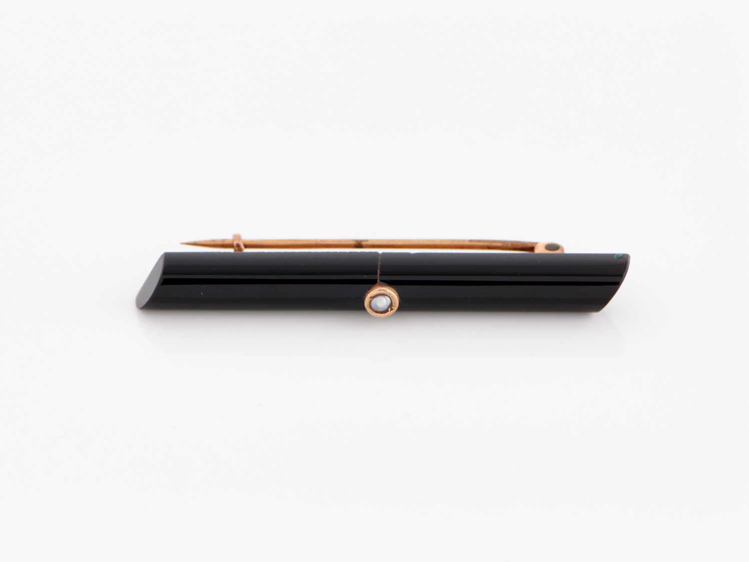 TWO ONYX AND SEED PEARL SET BROOCHES IN BASE METAL, LENGTHS 45MM AND 44MM