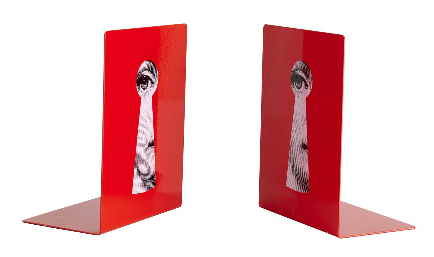 Red powder coated metal with Fornasetti face motifs.
