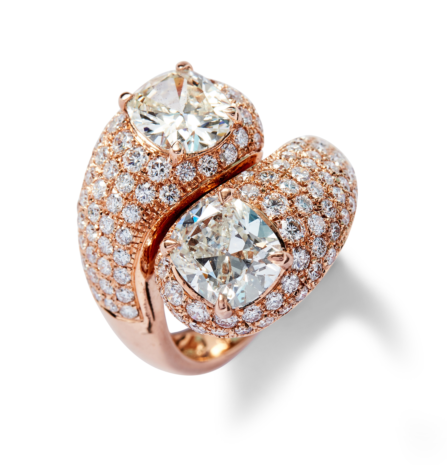 Of toi et moi design, the bombé terminals each claw-set with a cushion-shaped diamond weighing 2.02 carat and 2.49 carat respectively, framed by pavé-set brilliant-cut diamonds, the small diamonds together weighing approximately 2.00 carats, mounted in 18ct pink gold, size Q.