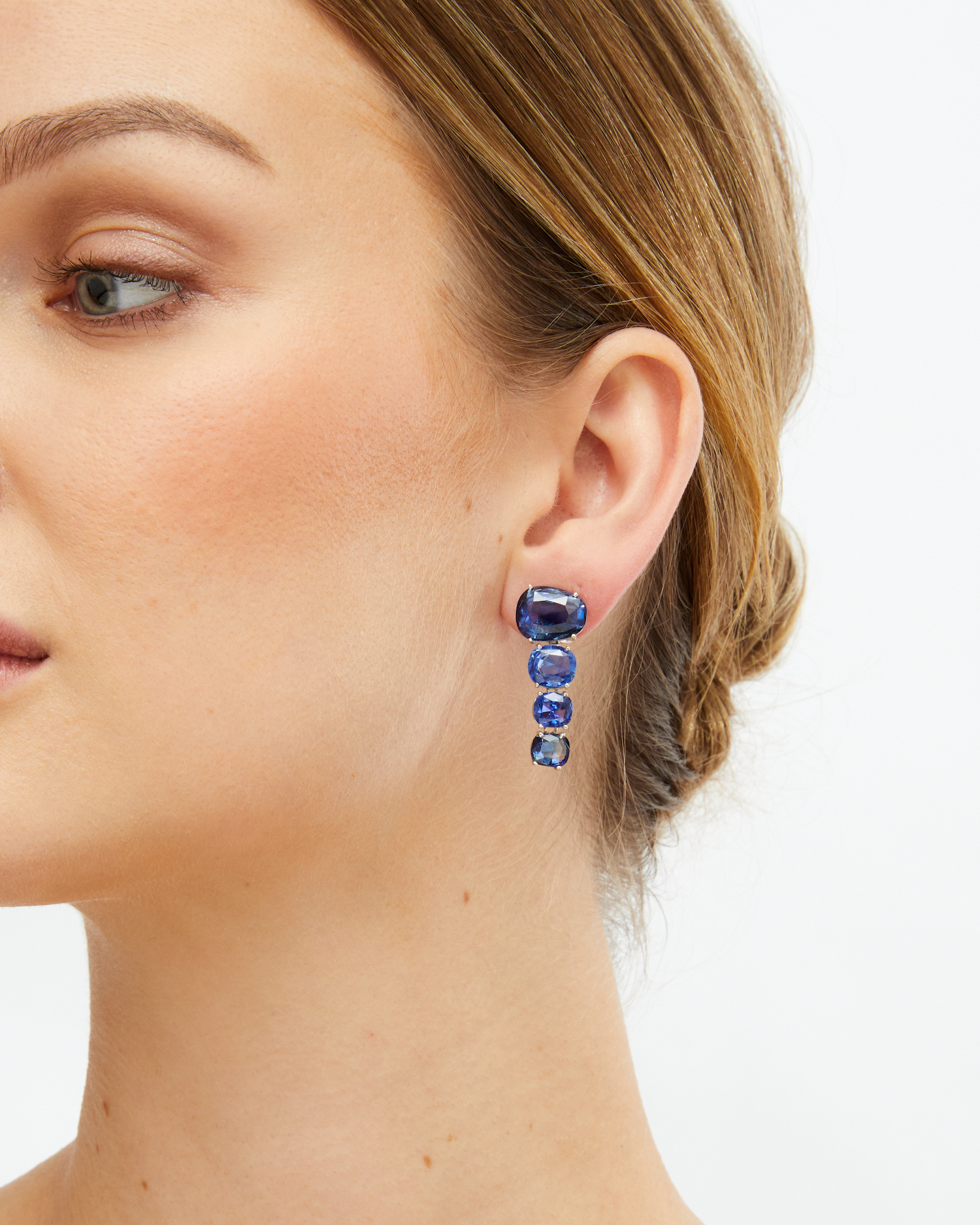 Each terminating in a swing drop of graduating claw-set mixed cut sapphires, supported by a similarly set surmount, the sapphires together weighing approximately 26.18 carats, mounted in 18ct white gold, length 34mm, post and clip fittings.