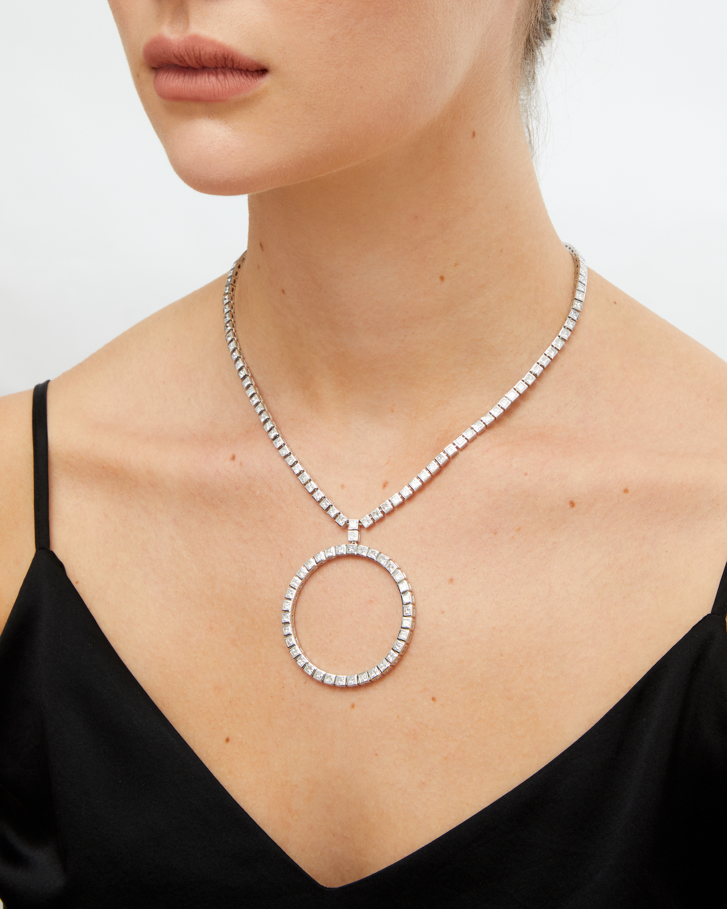 Terminating on an annular plaque box-set to the front with a line of princess-cut diamonds, supported from a continuous line of similarly set diamonds, the diamonds together weighing approximately 20.00 carats, mounted in 18ct white gold, pendant length 54mm, inner circumference 475mm.