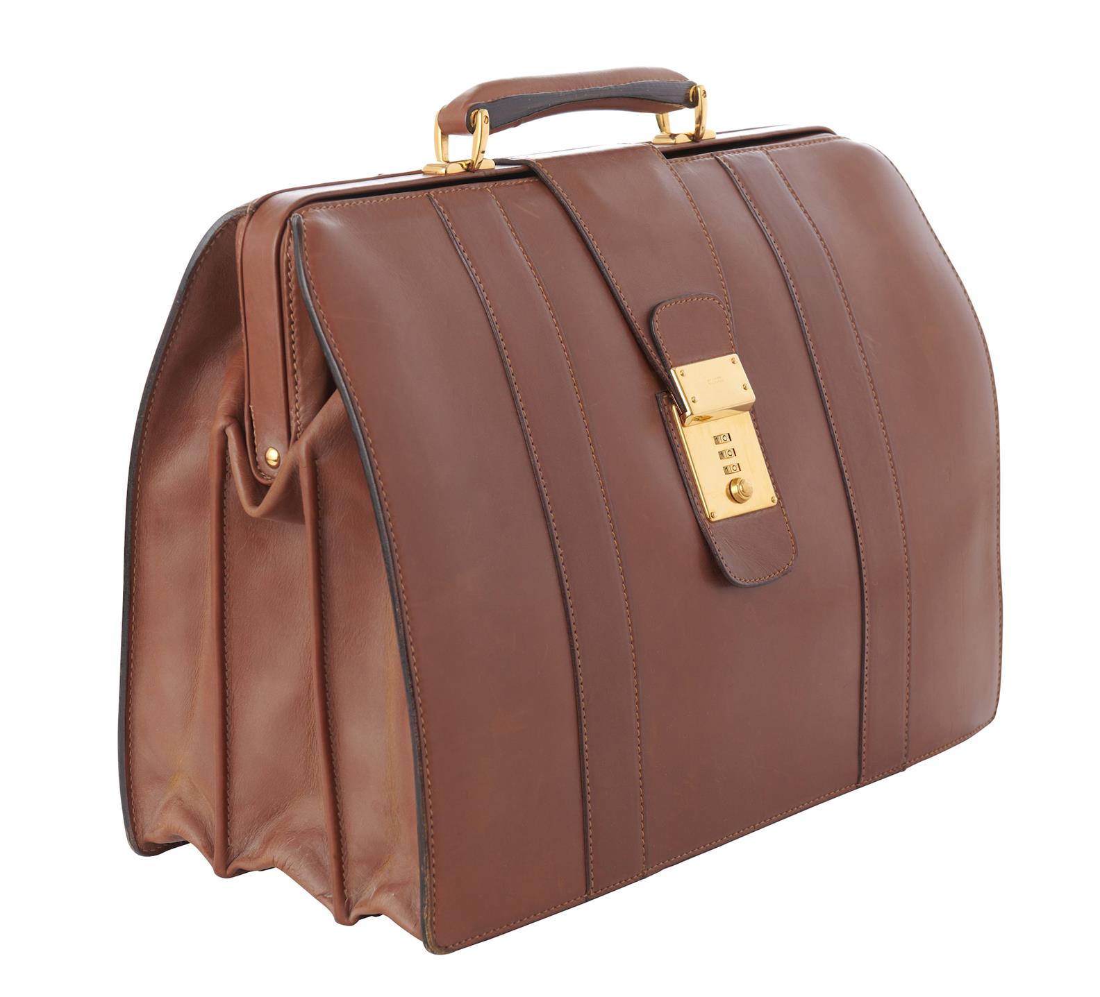 Styled in mid-tan leather with top handle, three inner compartments and gold tone metal hardware, circa 1990, 42 x 32 x 6cm.