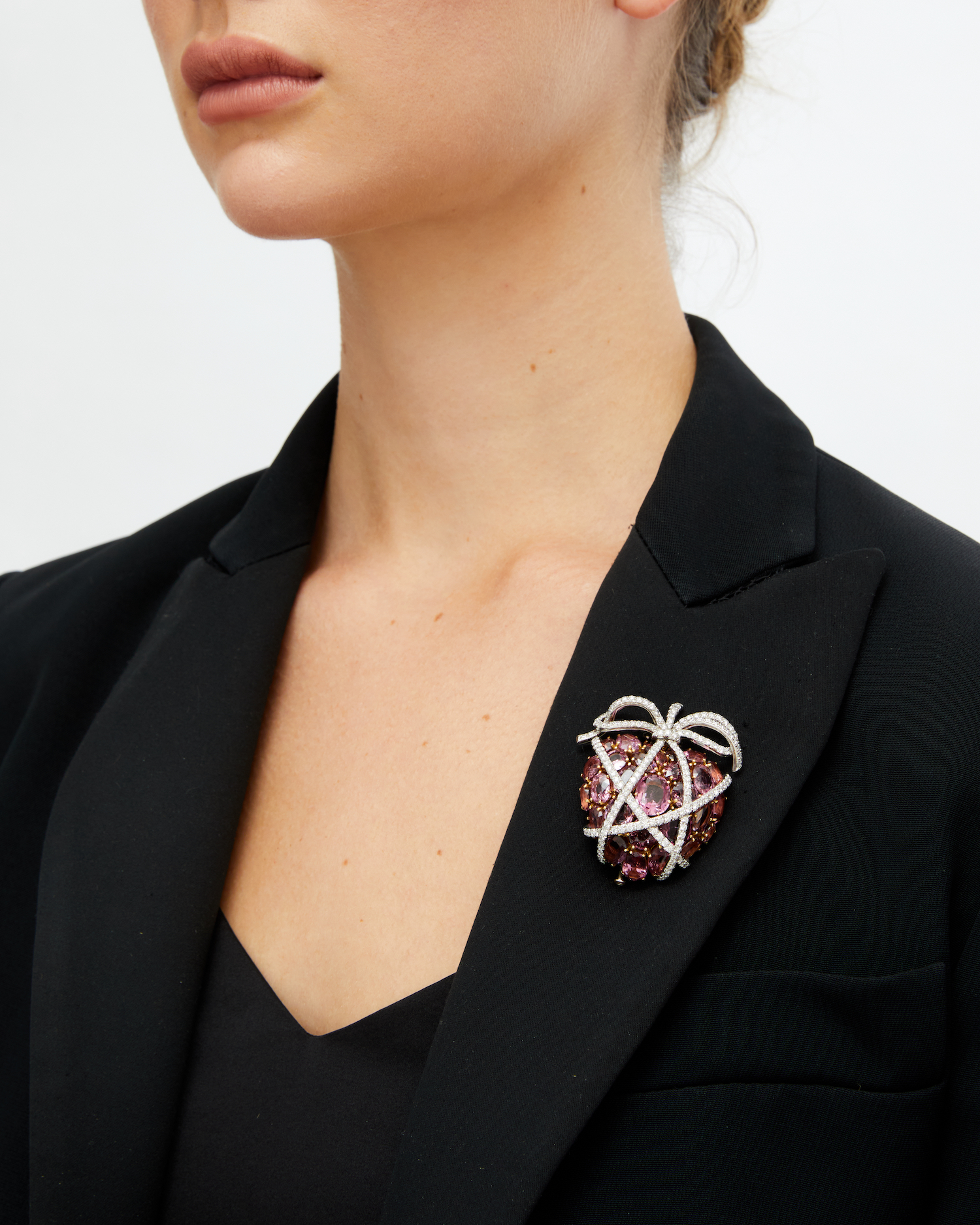Modelled as a bombé heart of cluster design, claw-set with variously shaped pink spinels applied with a ribbon and bow pavé-set with brilliant-cut diamonds, the 28 pink spinels and 185 diamonds together weighing approximately 45.19 carats and 3.16 carats respectively, mounted in platinum and 18ct gold, length 50mm, width 43mm, trombone clip fitting, signed Verdura.