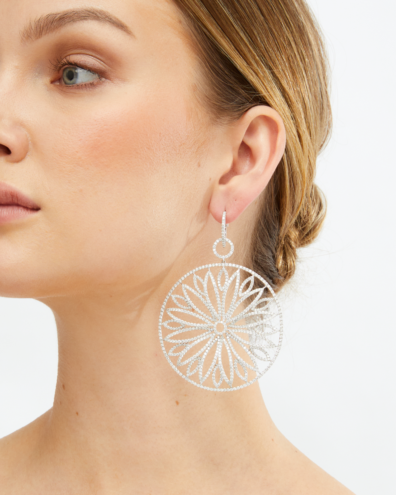 Each terminating in an annular plaque centring an openwork foliate design, pavé-set to the front with brilliant-cut diamonds, supported from a similarly set half hoop surmount between an annular connector, the diamonds together estimated to weigh appproximately 23.36 carats, mounted in 18ct white gold, length 92mm, width 65mm, post and clip fittings.