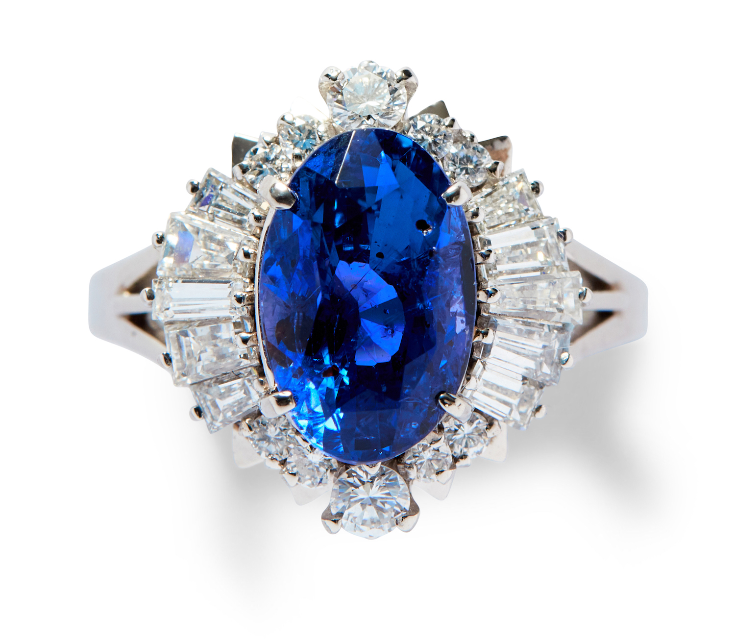 Of cluster design, centring a claw-set oval sapphire weighing 3.83 carats, framed by an undulating line of claw-set baguette and brilliant-cut diamonds, the small diamonds together weighing approximately 1.05 carat, mounted in platinum, size L.