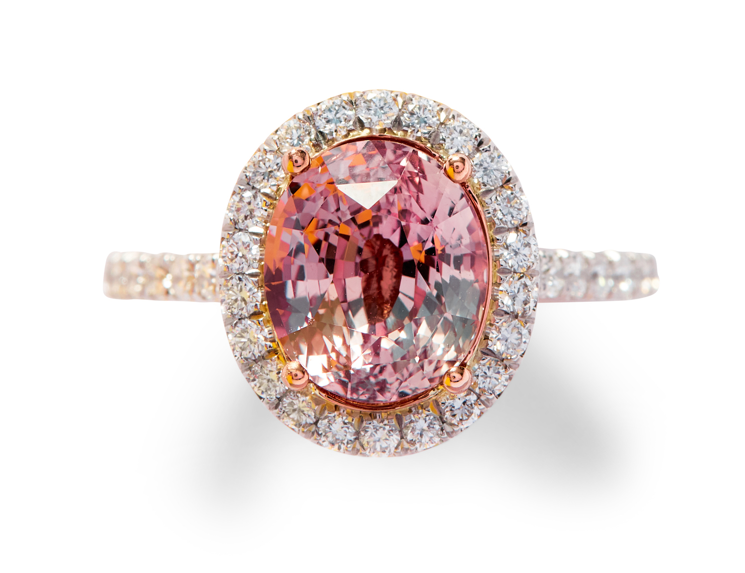 Of cluster design, centring a claw-set oval pinkish orange padparadscha sapphire weighing 3.60 carats, framed by a halo of brilliant-cut diamonds to similarly set shoulders, the 38 small diamonds together weighing approximately 0.54 carats, mounted in platinum and 18ct pink gold, size M.