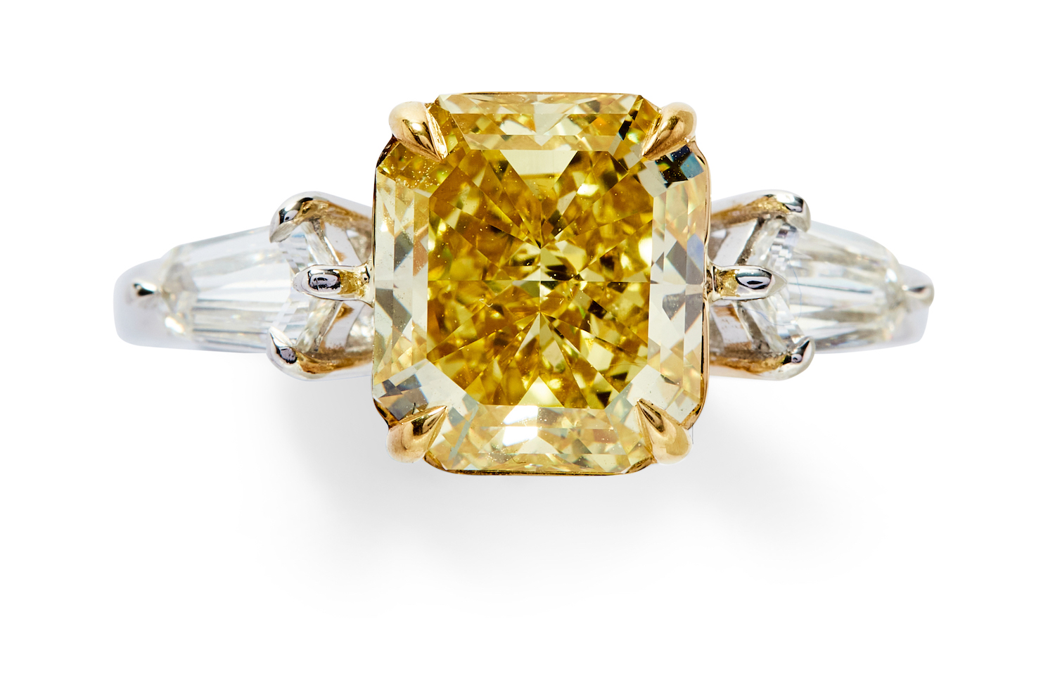 The cut-cornered rectangular mixed-cut fancy vivid yellow diamond weighing 3.57 carats, is claw-set between a pair of near-colourless shield-shaped diamonds, the small diamonds together weighing approximately 0.66 carats, mounted in platinum and 18ct gold, size L1/2.