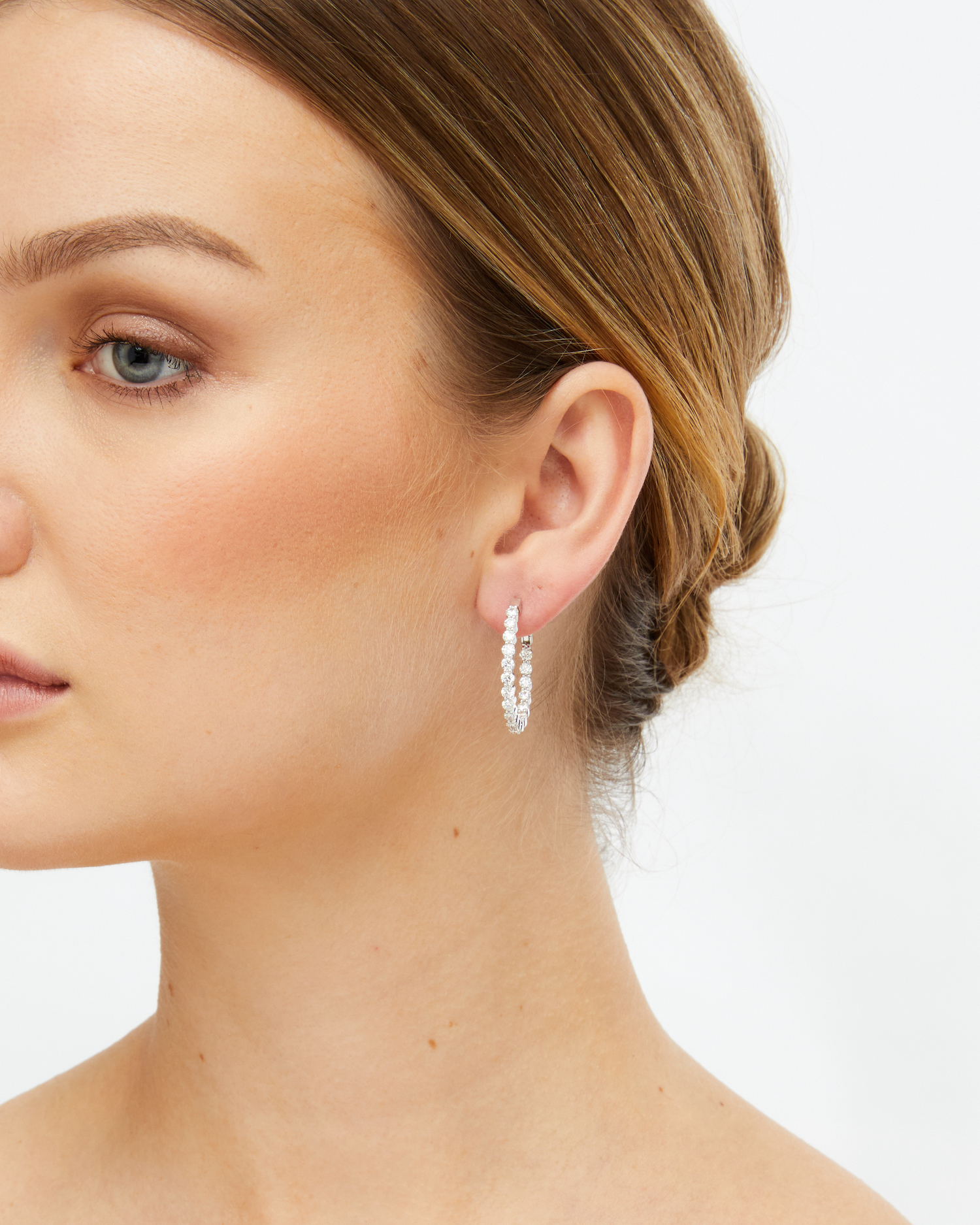 Each elliptical hoop claw-set to the front and inside back with a line of brilliant-cut diamonds together weighing approximately 3.10 carats, mounted in 18ct white gold, inner diameter 24mm, post fittings.