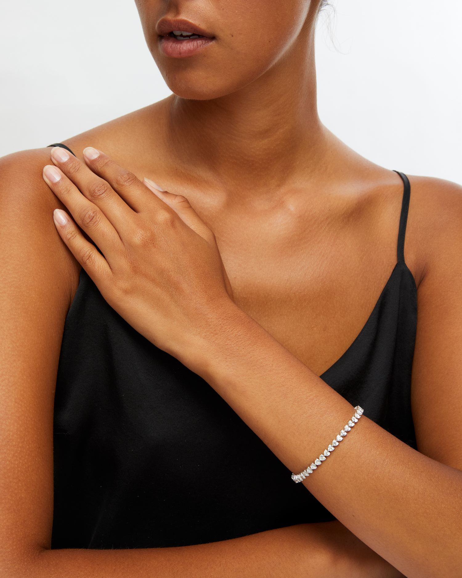 Composed of a line of 45 claw-set heart-shaped diamonds completed by a concealed box clasp, the diamonds together weighing approximately 8.82 carats, mounted in 18ct white gold, length 175mm.